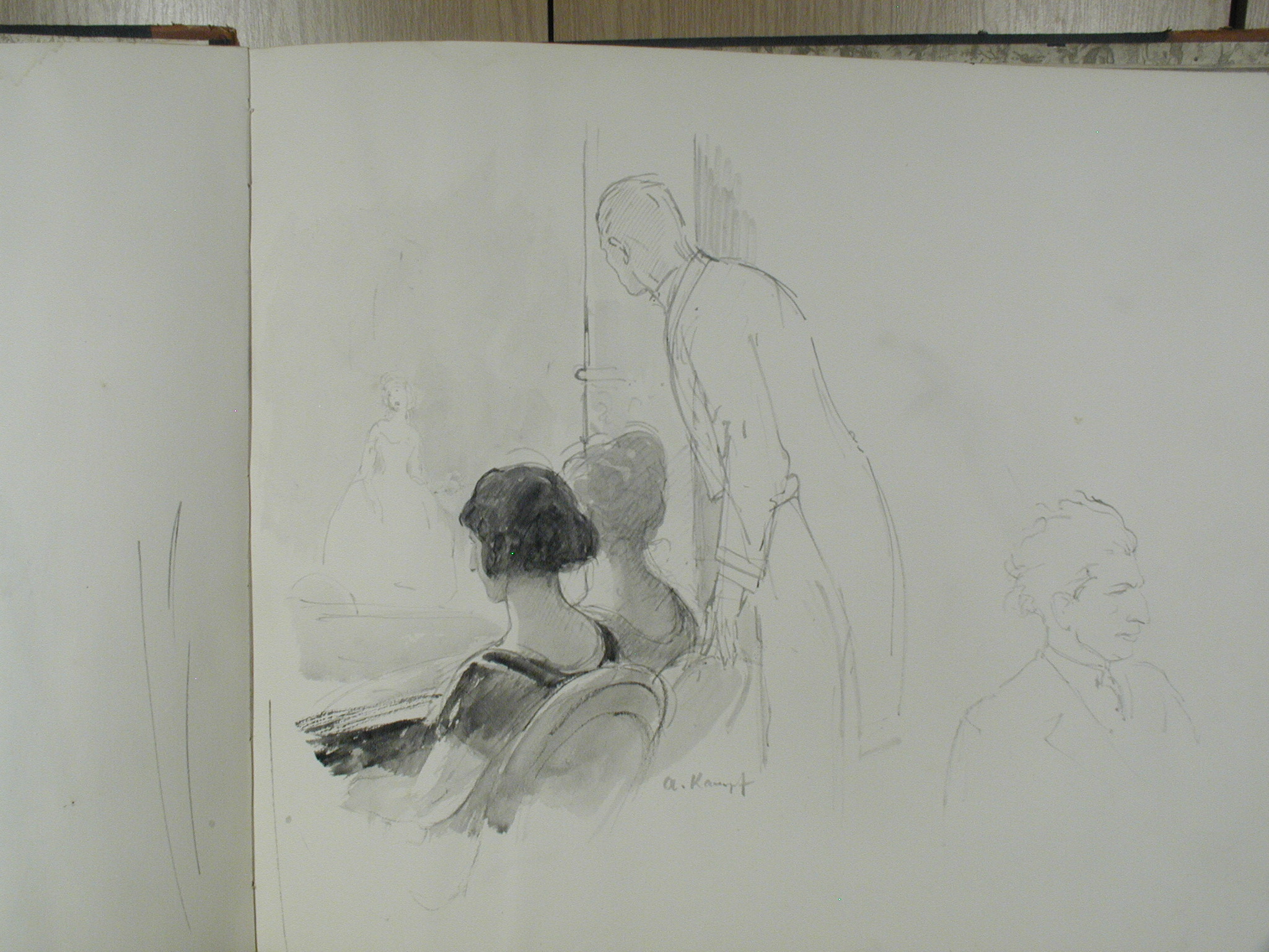 Информацiя об оригiнале: Унизу авторський підпис./Кількість: 1/Опис: Дві дами в ложі. Начерки. Зображені зі спини. Праворуч за ними чоловік у фраку.