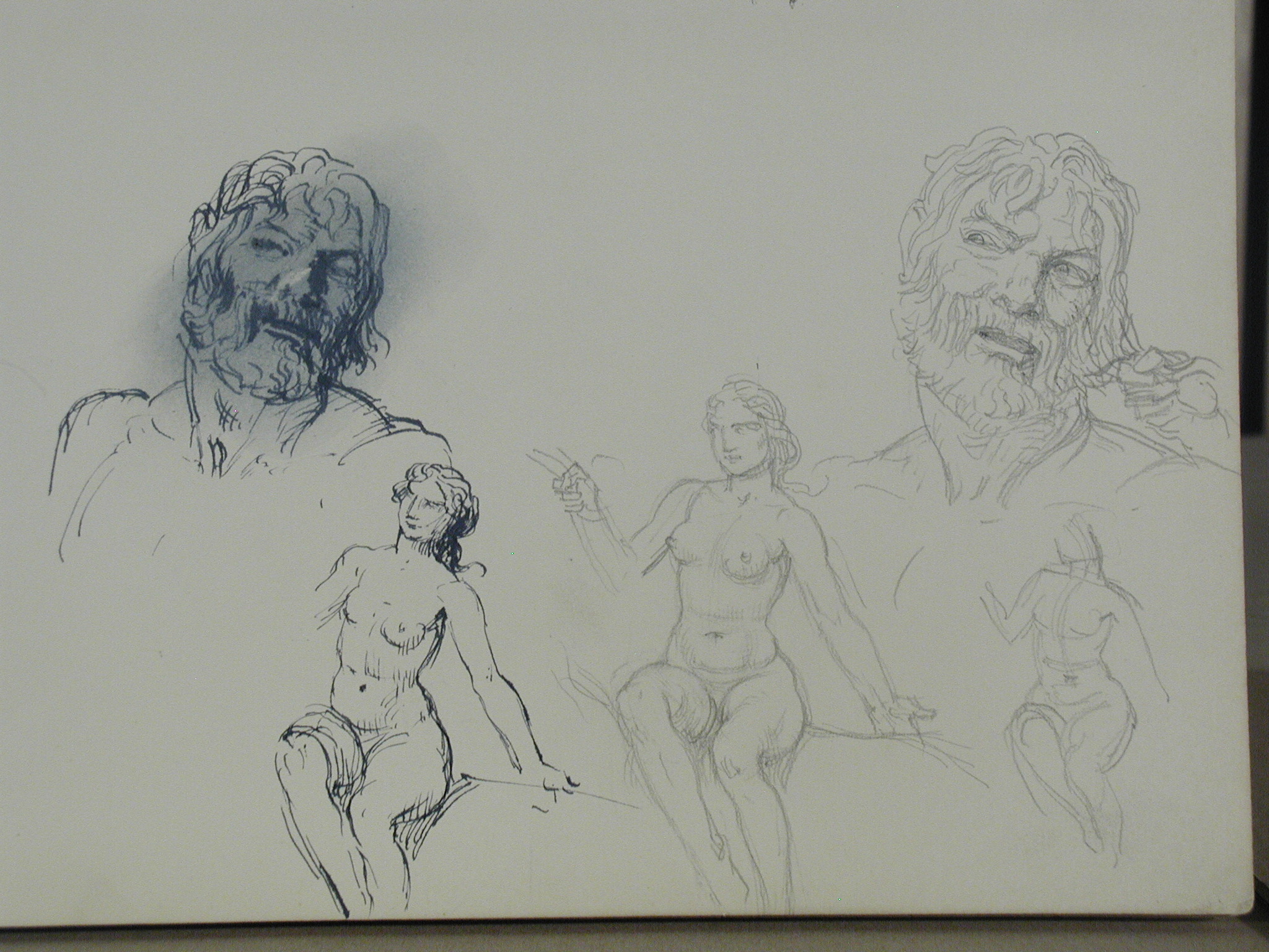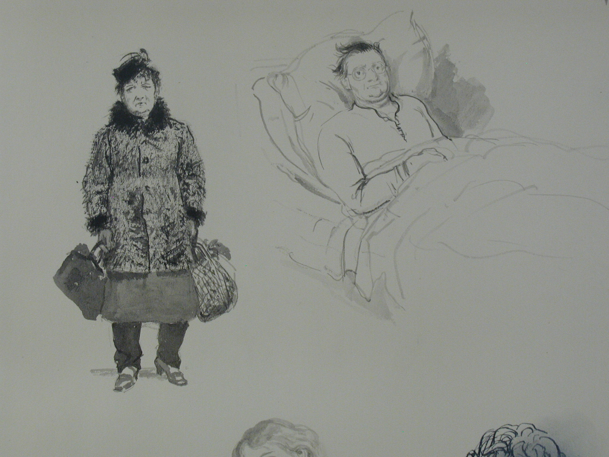 Кількість: 1/Опис: Одинадцять різних начерків. Вгорі зліва - жінка похилого віку з сумками в руках; в центрі чоловік у ліжку; справа - портрет чоловіка в капелюсі.