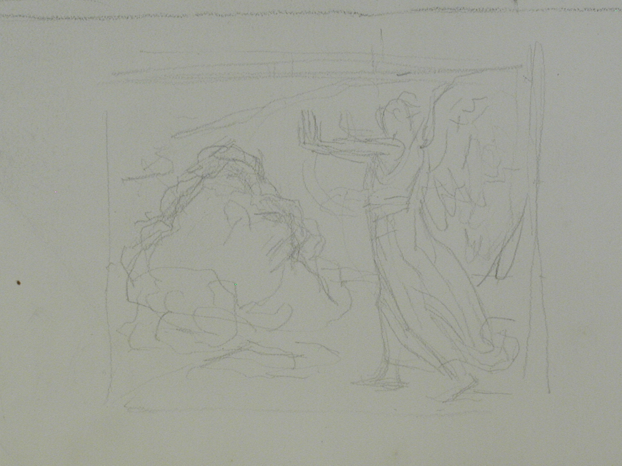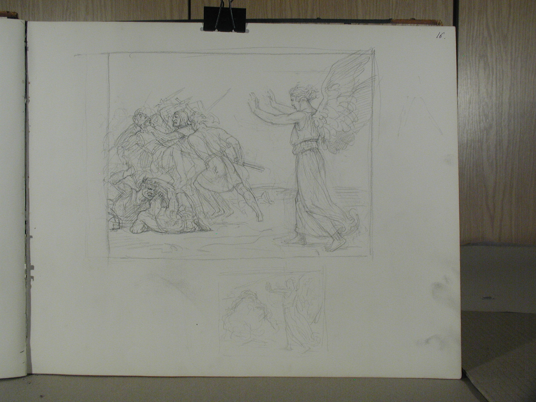 Кількість: 1/Опис: Ангел, що закликає до упокорення. Начерк. Зображений ліворуч, перед ним - битва воїнів.