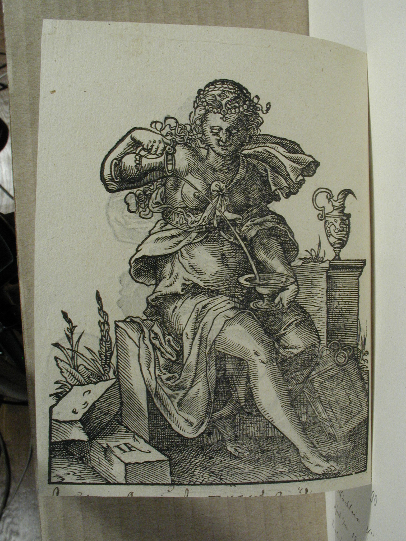 Аркуш обрізаний, правий верхній кут підклеєний (10х7), у правому нижньому куті слід блакитнуватого паперу, що приклеївся. Жовтуваті плями.,