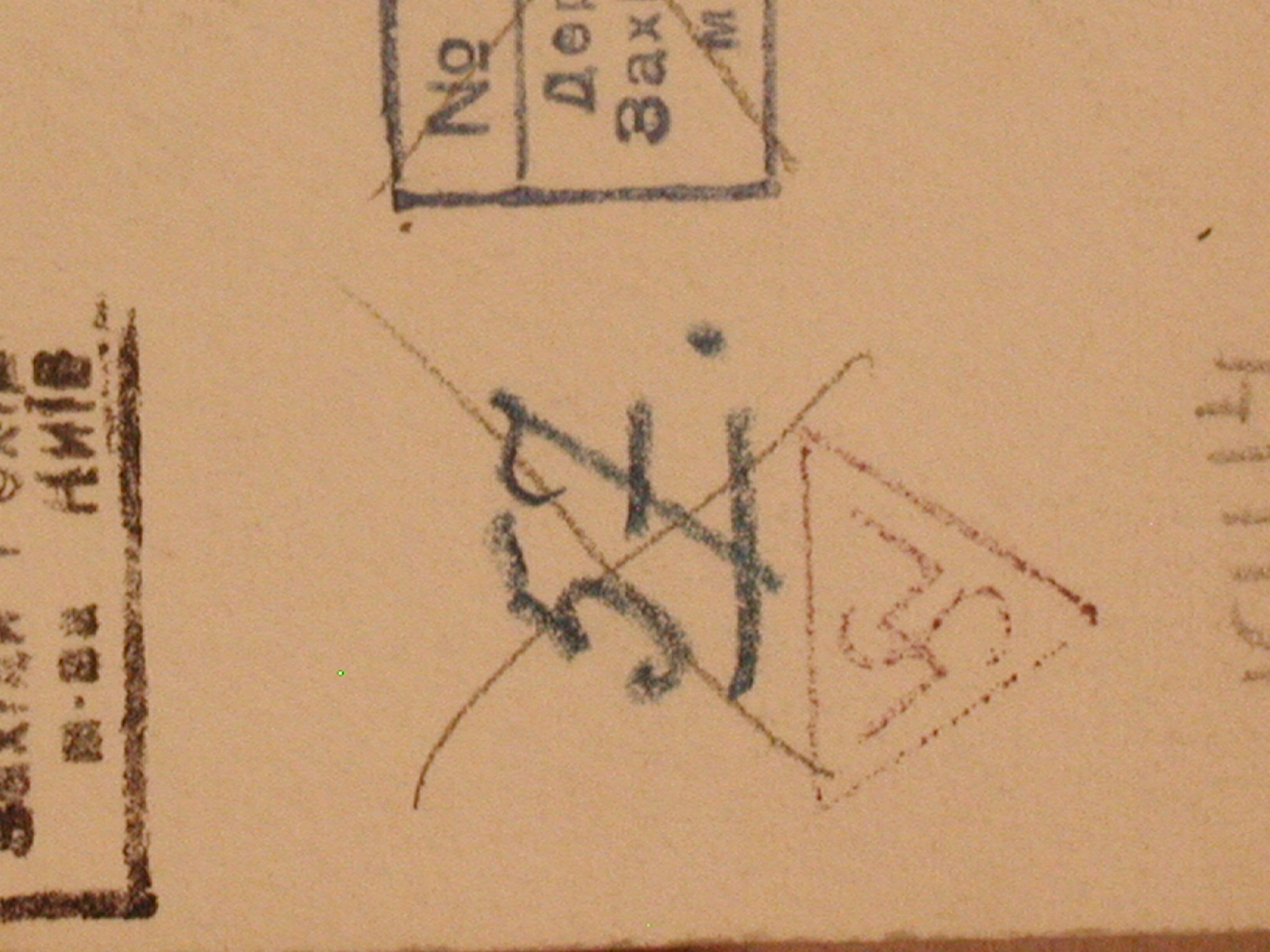 Аркуш обрізаний, наклеєний на папір, забруднення, плями.,