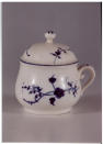 Додаток до назва (лист, ...): Горщик з кришкою. Підглазурний розпис синьою фарбою à la brindille/Авторські підписи, клейма: Зі зворотного боку на дні (синім): марка у вигляді мисливського рогу, поряд літера «Р». У тісті нерозбірливий знак./Історія Атрибуціi: Консультація Соловєйчік Р.С. (Ермітаж, 1961 р.) - Шантільї, сер. 18 ст. (мяка порцеляна; чашечка для крему)/Кількість: 1/Старі документи прийому: за списком № 140/Опис: Горщик з петлеподібною ручкою і випуклою кришкою з кулястою верхівкою; на кільцевій ніжці. Підглазурний розпис синьою фарбою à la brindille: на тулубі два пагони з листям та квітами, подібні ж пагони вміщені на кришці. Ручку прикрашає смуга з крапками, кулясту верхівку – стилізована квітка.