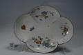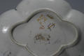 /Історія Атрибуціi: Консультація Соловєйчік Р.С. (Ермітаж, 1961 р.) - Шантільї, сер. 18 ст. (піддон; дуже хороший за якістю виконання; мяка порцеляна)/Кількість: 1/Опис: Піддон видовженої чотирьохчасточкової форми, на невисокій ніжці аналогічної форми. Поліхромний розпис у стилі какіемон: зображення комах та гілок з листям і квітами./Зв'язок з іншими предм. музею: піддон до соусника 213-ПК МХ