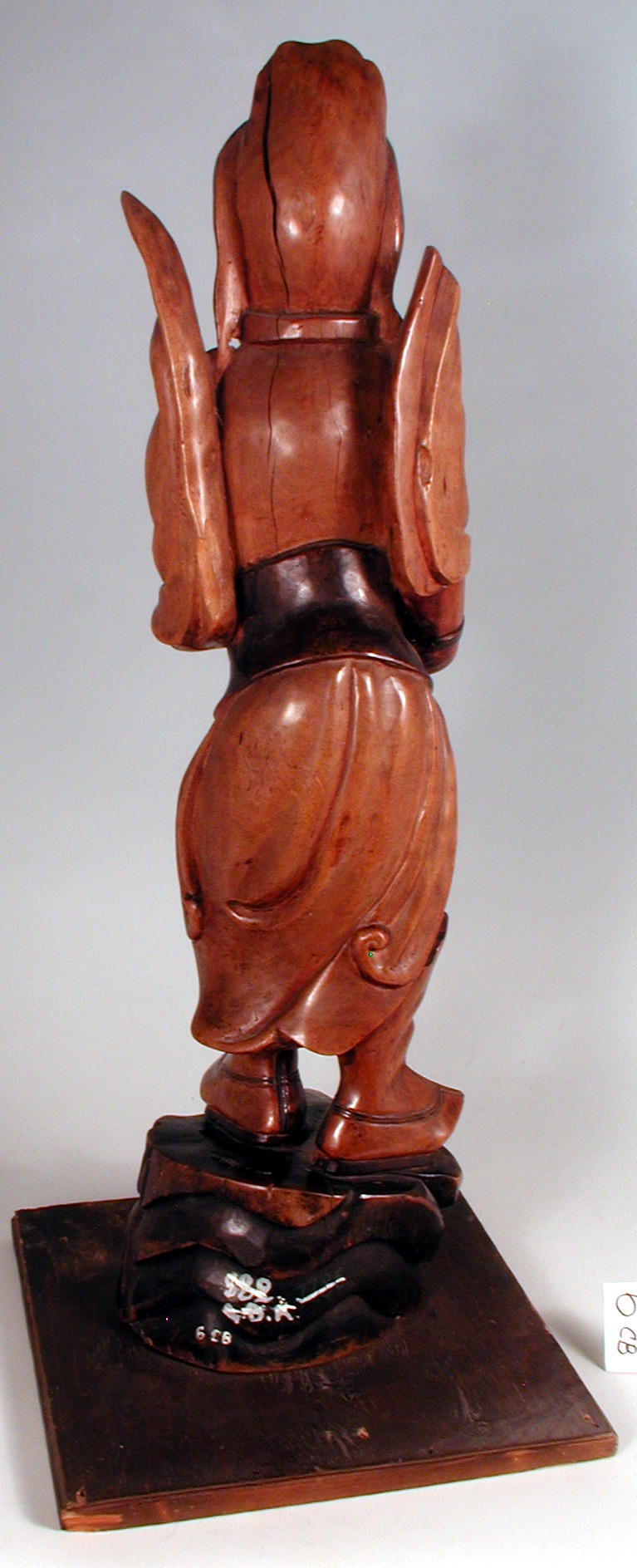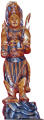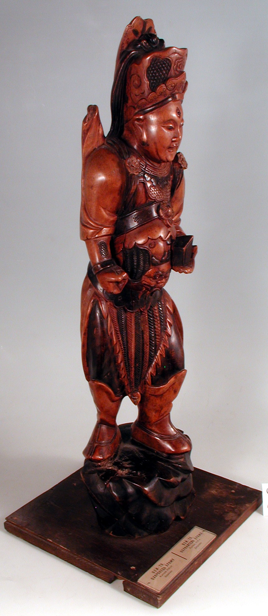 Закладка “Атрибуція” - Змiн. назва: Вей То - охоронець буддійського храму/Змiн.опис: Іконографічні ознаки вказують на образ Сканди або Вей То (韋馱), відомий щонайменше з 14 ст.: це безбородий молодий чоловік з третім оком в лобі. Він вбраний у повний бойовий обладунок з поясною прикрасою у вигляді голови хижої тварини. У правій руці просвітленої істоти видно отвір для атрибуту, який там колись знаходився. (Найімовірніше, це довга вузька вузлувата палиця, схожа на меч.) У лівій руці зображений тримає кристал, що часто є атрибутом божеств і духів східного сектору неба./Змiн. час створення: 19 ст.Изм. техника: лак