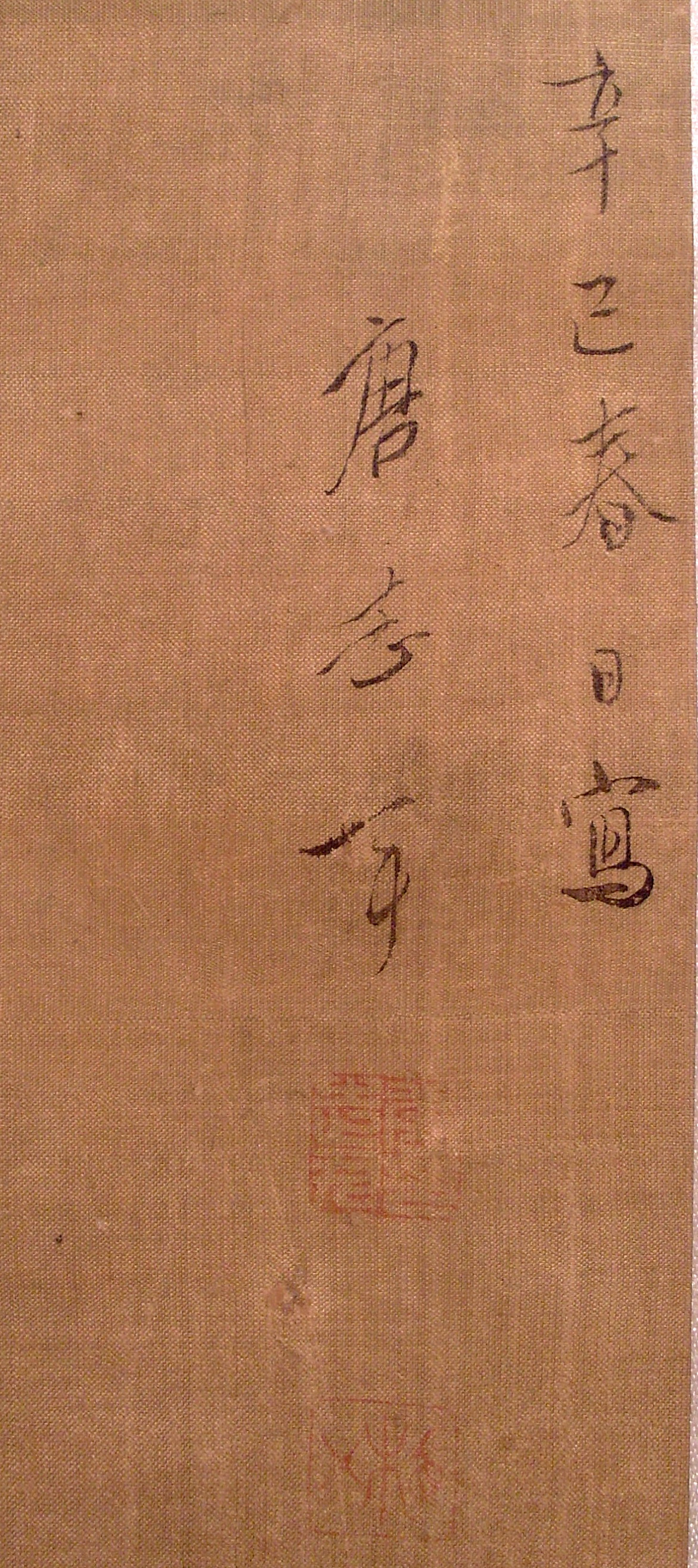 Информацiя об оригiнале: Праворуч вгорі: "Весняного дня року Сінси писав Тан Чжиінь"/Історія Атрибуціi: 1) Липень 1933 – грудень 1943 Ван Бінхуй (Жозеф Вампінфи) визначив як твір Тан Чжиінь (жив бл. 1573) (рукописний архів музею 633 КЖ) ; 2)1963 р. Музей Гугун, Ян Бода і Тянь Сю: «Оригінал»; 3) 1965 р. Інститут Історії Мистецтва (Москва) Соколов: «VIII група «блідого штампу». Кінець 18 – поч. 19 ст. Але враховуючи думку Гугун – Тан Чжиінь (?)» (інвентарна картка); 4) 2012 Логвин М.Ю. «Почерк підпису дуже схожий на єдиний відомий зразок підпису до серії віял «Птахи летять на осіннє збіжжя». Див. Zhong guo shu hua jia yin jian kuan shi cmор. 833. Проте одна з печаток (верхня) досить сильно відрізняється від єдиної відомої. Друга печатка взагалі не належить художникові.»/Кількість: 1/Опис: На вертикальній гілці з квітами, підфарбованими зеленим і рожевим кольором, сидять три великі сірі птахи. Дві з них сидять низько, на одному рівні. Ліва розкрила дзьоб, права сховала голову в пір’я. Третя пташка сидить над ними, обернувши голову ліворуч.