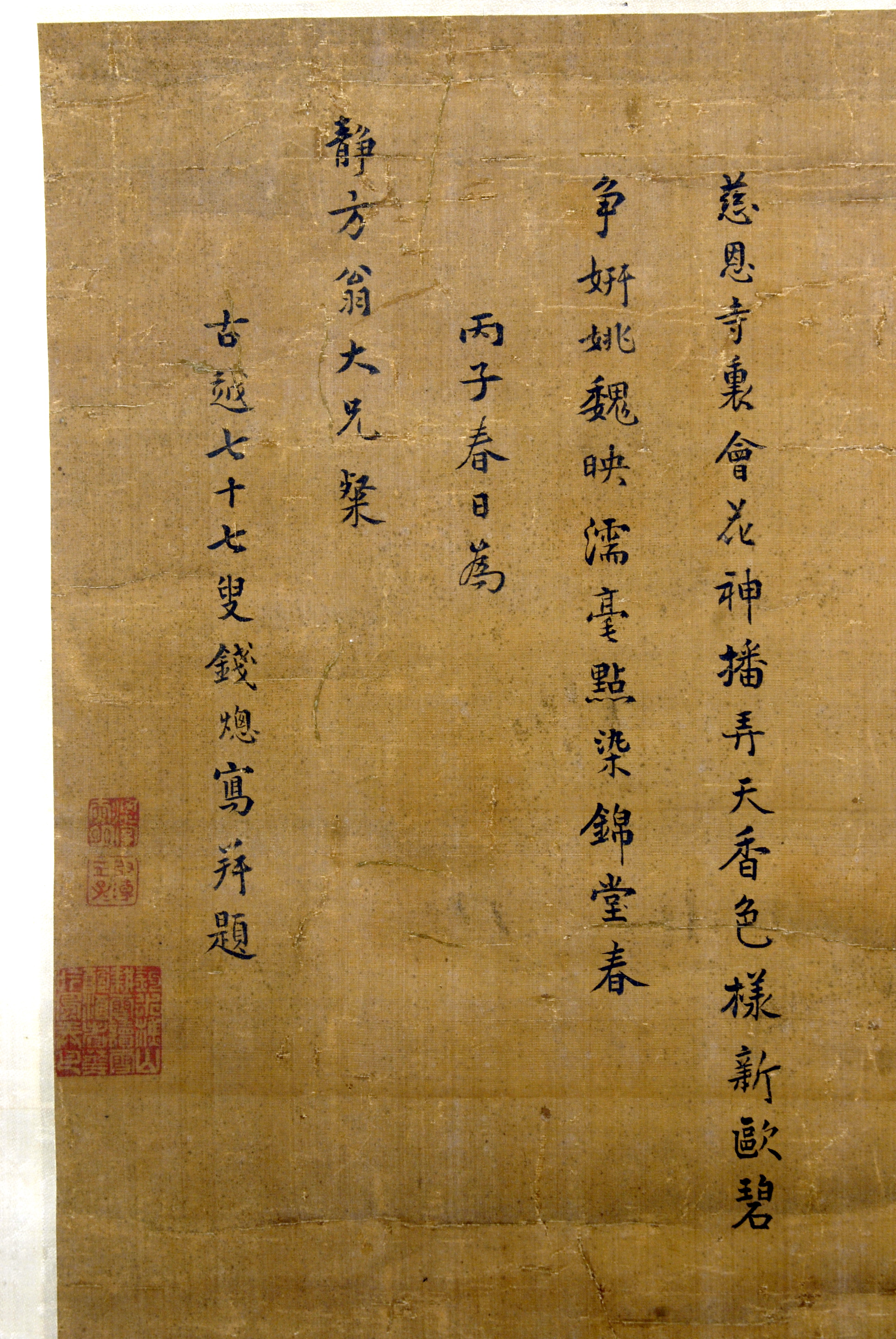 Історія Атрибуціi: 1) Липень 1933 – грудень 1943 Ван Бінхуй (Жозеф Вампінфи) визначив як твір Цянь Сі (рукописний архів музею 687 КЖ); 2) 1963 Музей Гугун (Ян Бода і Тянь Сю) «Цянь Сі, 1696 р.. На думку консультанта – 1876 або 1816. Художник невідомий, пізній період Кансі»; 3) 1965 Інститут Історії Мистецтва МК СРСР (Москва) Соколов С.Н.: «Цянь Сі (1696), але художник невідомий. Група V. Грубий, неприємний живопис.» (інвентарна картка); 4) Під словами "але художник невідомий" Соколов, імовірно, мав на увазі "цей художник не став знаменитим". Імені художника справді неможливо знайти у мистецтвознавчій літературі. (М. Логвин, 2017)/Кількість: 1/Старі документи прийому: Акт закупівлі № 157 від 20.11.1959/Опис: У нижній частині сувою по центру зображено фазана з білою головою, червоними груддю і хвостом, крилами з зеленими, червоними і синіми частинами. Птах сидить на скелі, яка нависає у лівий бік, і стежить за білим метеликом ліворуч. На передньому плані перед птахом і за ним – різнокольорові кущі півоній. На задньому плані праворуч зображено дерево з великими блідо-рожевими квітами і досить великим зеленим листям, схоже на айву.