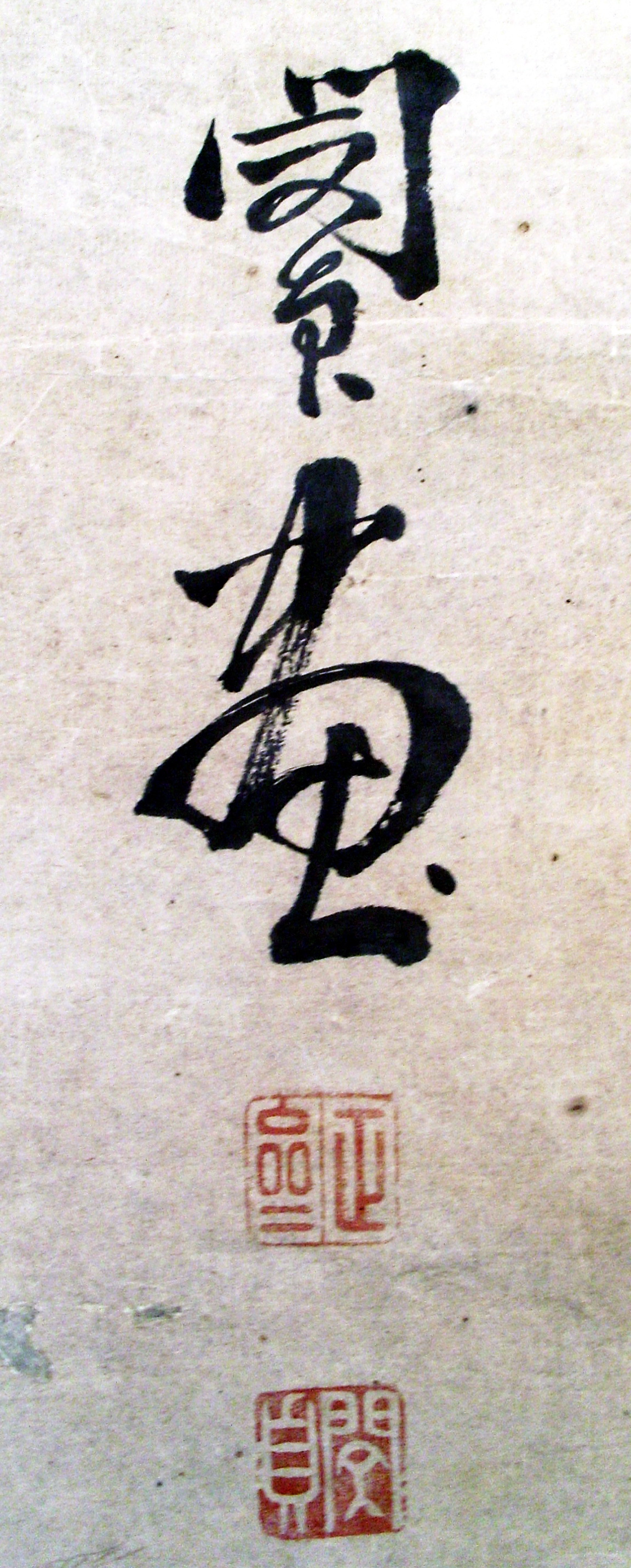 Комм.: Ming Zhen. Old Man Offering Plum Blossom. Ink, watercolor on paper/Информацiя об оригiнале: У верхньому лівому кутку підпис художника «Мін Чжень»/Історія Атрибуціi: 1. 1) Липень 1933 – грудень 1943 Ван Бінхуй (Жозеф Вампінфи): «Фарби на папері [розташовані] великими плямами. (…) Начерк жваво виконаний з великою впевненістю, борода надто стилізована.» Ван Бінхуй висловлює припущення, що, судячи з костюму, зображений може бути поетом Су Ше. (рукописний архів музею № 893-1 КЖ); 2) 1965 р. Інститут Історії Мистецтва (Москва) Соколов С.Н.: «Мін Чжень (?)». (інвентарна картка); 3) 2011 Логвин М.Ю.: «Підпис не співпадає з жодним відомим, набагато складніший і детальніший за вказані у довіднику. Відповідників верхньої печатки не знайдено. Нижня печатка майже ідентична печатці до серії зображень восьми божеств даоського пантеону.» (Zhong guo shu hua jia yin jian kuan shi cmор. 1195 - 1197/Кількість: 1/Старі документи прийому: Акт закупівлі № 157 від 20.11.1959/ншi написи, штампи, печатки, етикетки, наклейки: Ліворуч вгорі, під підписом, дві печатки: верхня «Чжен Чжай» (творчий девіз – товсті червоні риски ієрогліфів на білому тлі, у тонкій червоній рамочці, поля обох ієрогліфів розподілені вертикальною рискою); нижня «Мін Чжень» (білі ієрогліфи на червоному тлі)