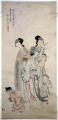 Кількість: 1/Старі документи прийому: Акт закупівлі № 157 від 20.11.1959/Опис: Вертикальний сувій на монтуванні. Жанр портретного живопису «персонажі» та жіночого портрету. На порожньому фоні на повен зріст зображено групу з трьох жінок. У жінки праворуч в руках квітуча гілка; жінка посередині тримає коробку з настільною грою. Ліворуч на передньому плані хлопчик підпалює петарду. Праворуч зв жінок ховається інший хлопчик, затуляючи вуха руками в очікуванні вибуху петарди. Ліворуч вгорі – підпис, печатки.