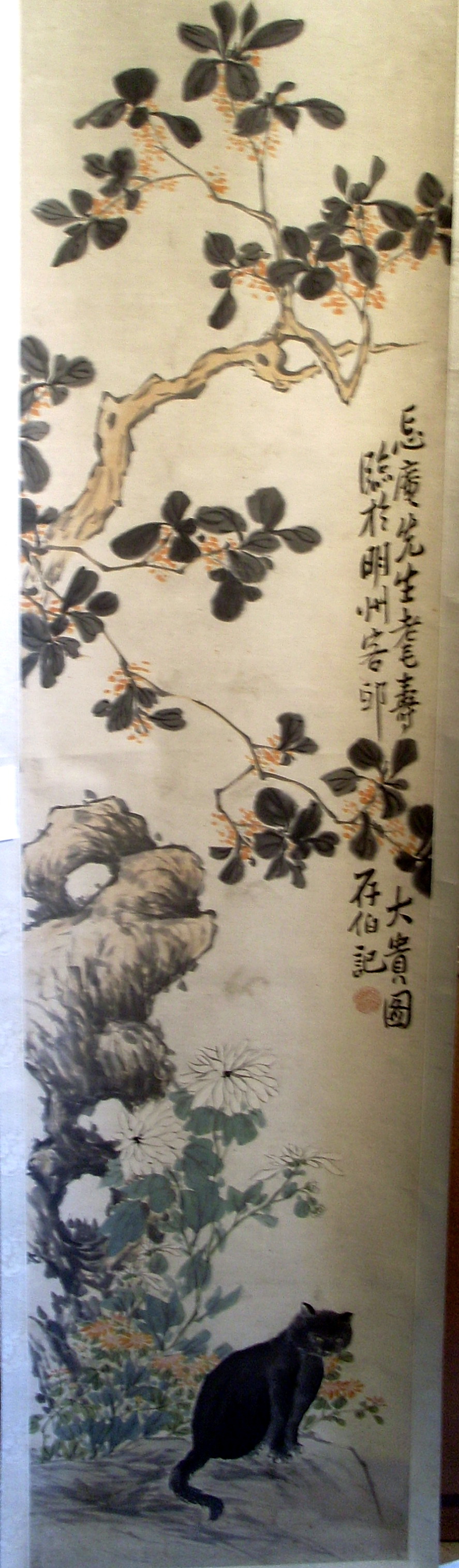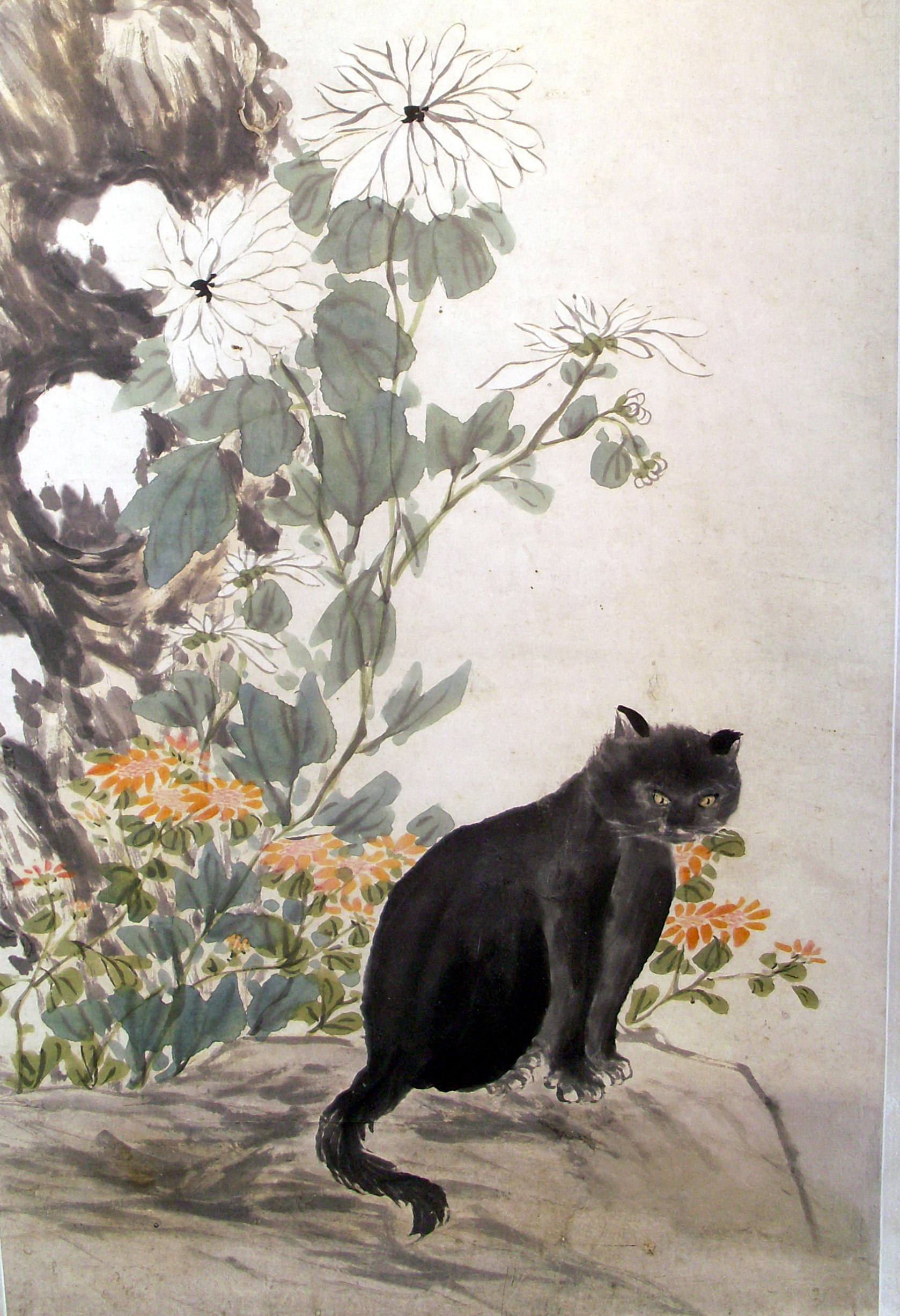 Комм.: Коти були справжніми помічниками у виробництві шовку, адже знищували щурів і мишей, які любили ласувати гусінню шовкопряда. Співзвучність слова "кішка" і "людина віком за 80 років" зробили кішку символом довголіттяю Образ кота в китайській культурі - позитивний і доброзичливий./Історія Атрибуціi: 1) Жозеф Вампінфи (Ван Бінхуй) визначив як твір Чжоу Сянь 周闲, який працював бл. 1850-1870 рр. (рукописний архів музею 943-3); 2) 1965 (?) Соколов С.Н.: "Див. № 943-1" (інвентарна картка)/Кількість: 1/Старі документи прийому: Акт закупівлі № 157 від 20.11.1959/Опис: На передньому плані трохи праворуч сидить чорна кішка. Вище ліворуч - кущ білих хризантем, над ним - брила ажурного каменю. Вгорі ліворуч - гілки кориці з оранжевими квітками, які розгалуджуються вгору і вниз.