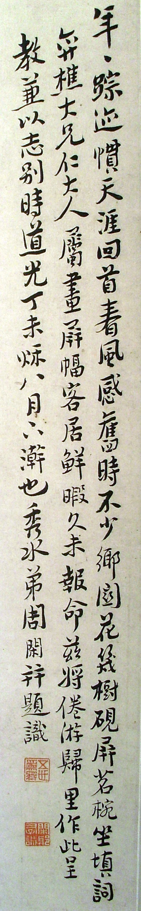 Історія Атрибуціi: 1) Ван Бінхуй (Жозеф Вампінфи) визначив як твір Чжоу Сянь (рукописний архів музею 943-4 КЖ); 2) 1963 Музей Гугун (Ян Бода і Тянь Сю) «Оригінал»; 3) 1965 Інститут Історії Мистецтва МК СРСР (Москва) Соколов С.Н. "Див. 943-2 КЖ." (інвентарна картка)/Кількість: 1/Старі документи прийому: Акт закупівлі № 157 від 20.11.1959/Опис: У лівому верхньому кутку – широка сіра скеля, що нависає згори вниз великими друзами. Зі скелі по вертикалі вниз звисає стовбур сливи, гілки якої з рожевими квітами тягнуться і перехрещуються скрізь на сувої. Внизу, на одній з гілок сидить великий білий птах з блакитним чубчиком і довгим білим хвостом.