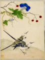 /Кількість: 1/Старі документи прийому: Акт закупівлі № 157 від 20.11.1959/Опис: Твір у жанрі "квіти і птаих", стиль "стараний пензель". На порожньому білому фоні зліва вгорі зображено суху гілку з червоними ягодами, яку оповиває рослина іпомеї з квітами. Нижче, на умовно зображеном пагорбі з моріжком, у профіль, оберненеими вправо, показано двох птахів (плиска біла - Motacila alba). Внизу ліворуч - печатка.