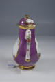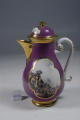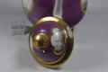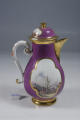 Авторські підписи, клейма: Марка синя надглазурна; літера золотом: S/Історія Атрибуціi: Консультація Соловєйчік Р.С. (Ермітаж, 1961 р.) - (кавник; ймовірно фальшивий)/Кількість: 1/Опис: з кришкою, грушоподібний, на кільцеподібній ніжці; розпис: у двох фігурних резервних, обведених золотом, медальйонах - пейзажі. Носик та ніжка - золочені; на ручці - червона квіточка.