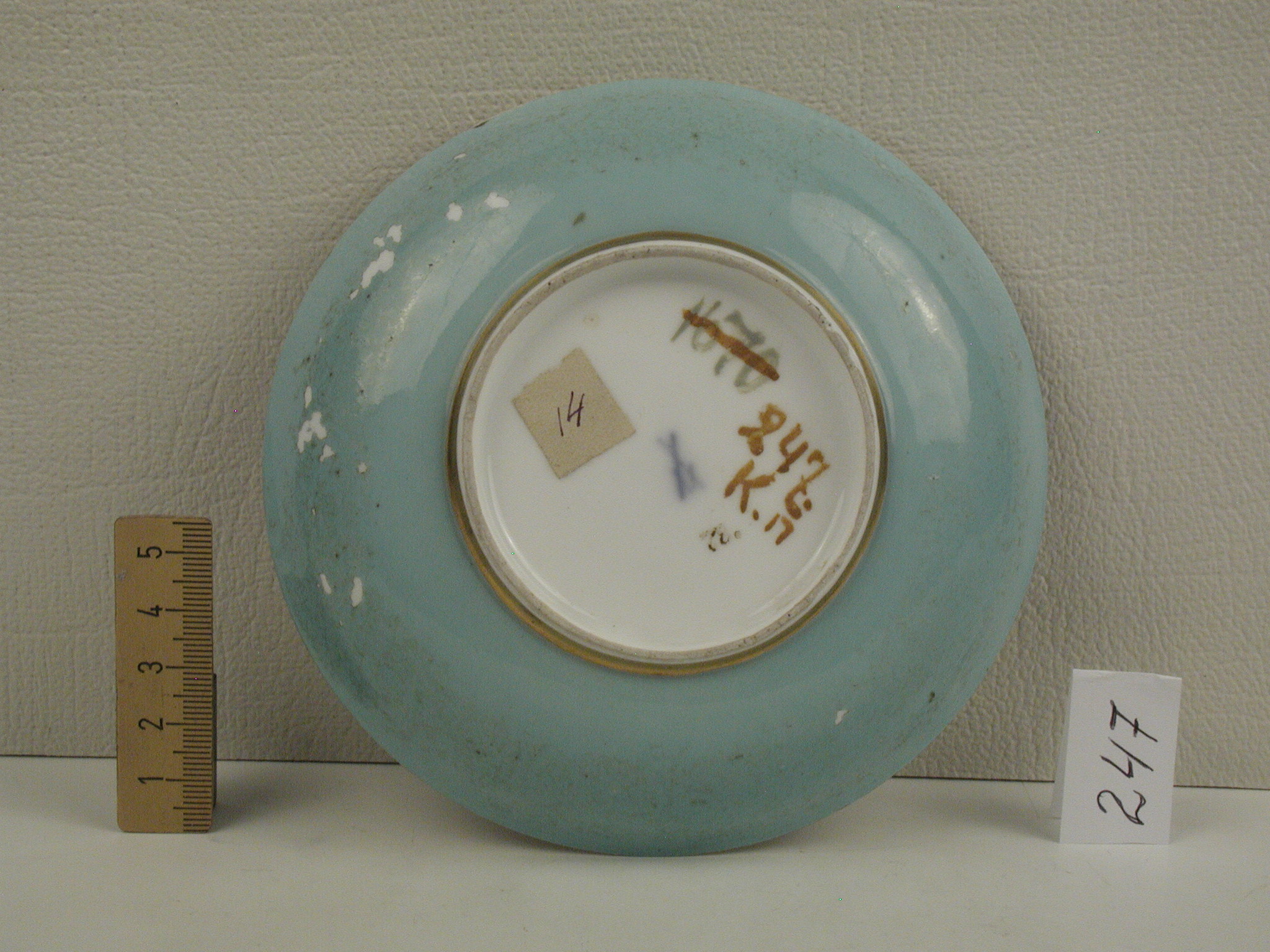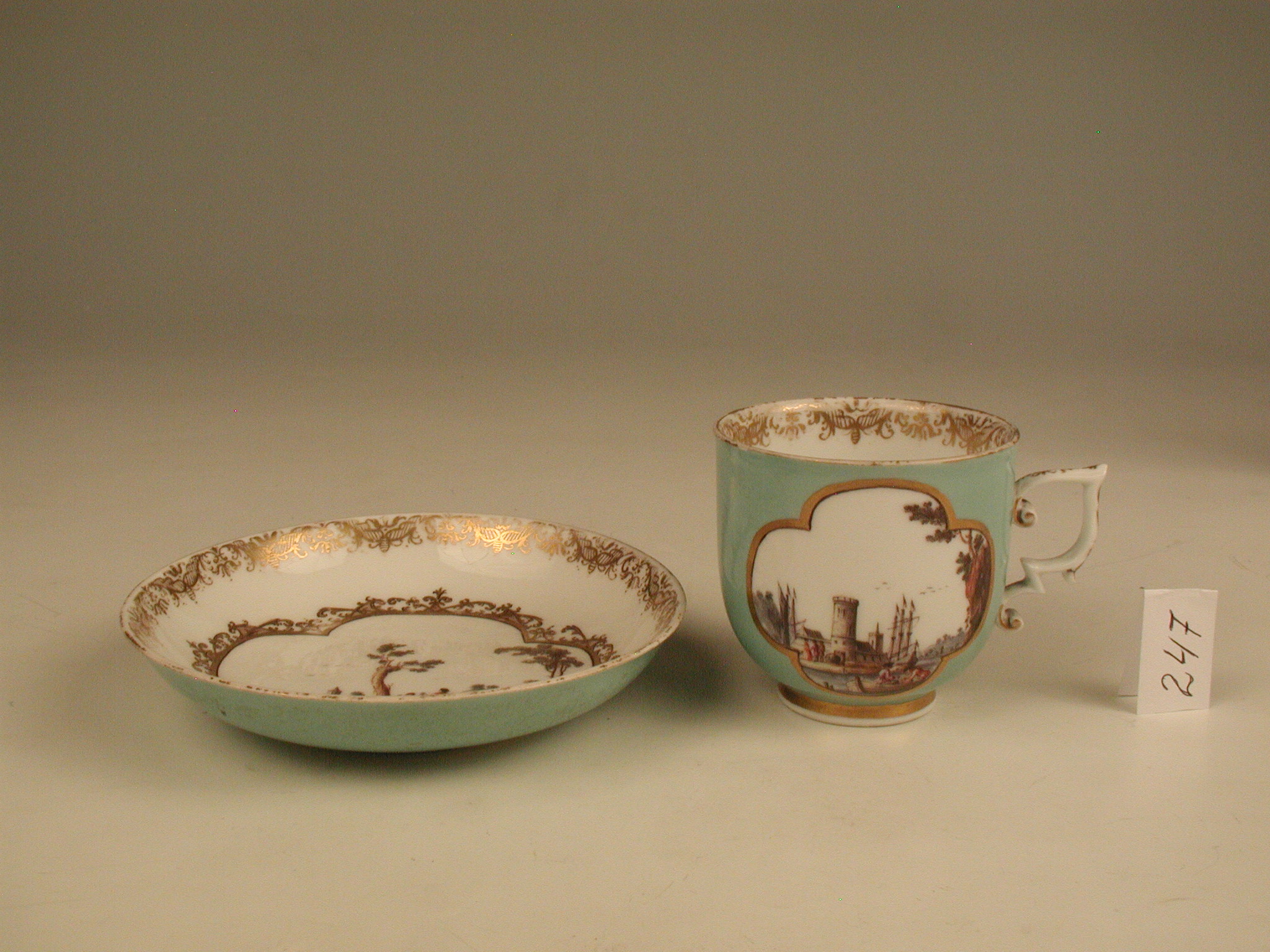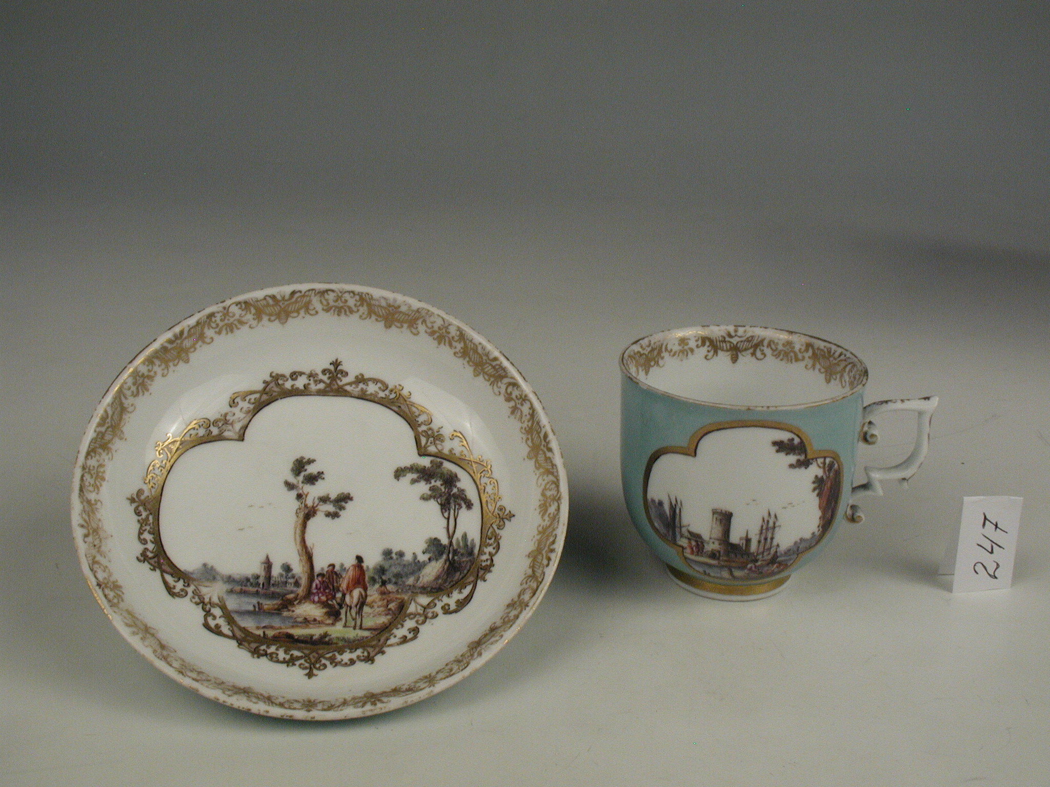 Історія Атрибуціi: Консультація Соловєйчік Р.С. (Ермітаж, 1961 р.) - Мейсен, бл. 1740 р. (фонофий розпис; хороша за якістю виконання)/Кількість: 1/Опис: із скругленим бортом; розпис: у фігурному медальйоні, обрамленому тонким золотим орнаментом, - пейзаж із вершником та групою людей під вербою. Борт з зовнішнього боку - бірюзовий./Зв'язок з іншими предм. музею: блюдце до чашки МХ ПК 246