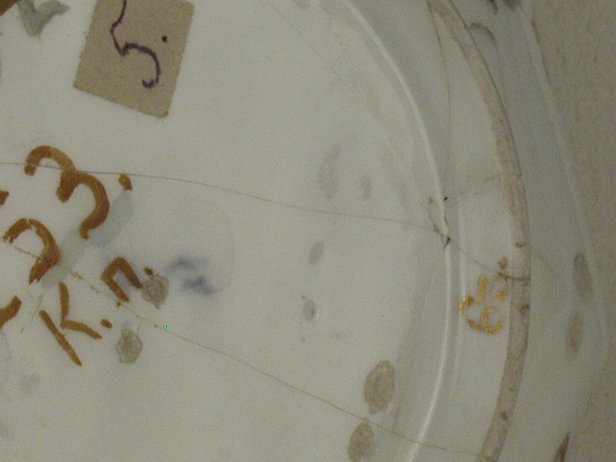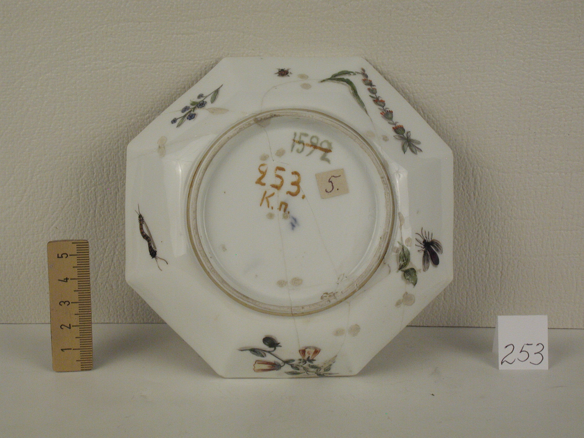 Авторські підписи, клейма: марка синя підглазурна: схрещені мечі/Історія Атрибуціi: Консультація Соловєйчік Р.С. (Ермітаж, 1961 р.) - Мейсен, бл. 1740-их рр./Кількість: 1/Опис: восьмигранне/Зв'язок з іншими предм. музею: блюдце до чашки МХ ПК 472