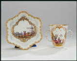 Закладка “Атрибуція” - Змiн. розміри: 12,6 х 12,9/Змiн. Написи, клейма, марки: марка синя на бісквіті: схрещені мечі; золотом літера: G (?)/Змiн. час створення: 1735 - 1740Новый материал: порцелянаИзм. техника: надглазурний поліхромний розписИзм. техника: золоченнямісце створення, школа: Королівська порцелянова мануфактура