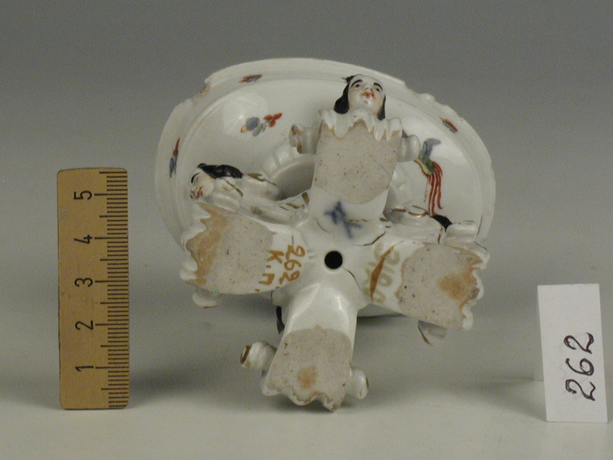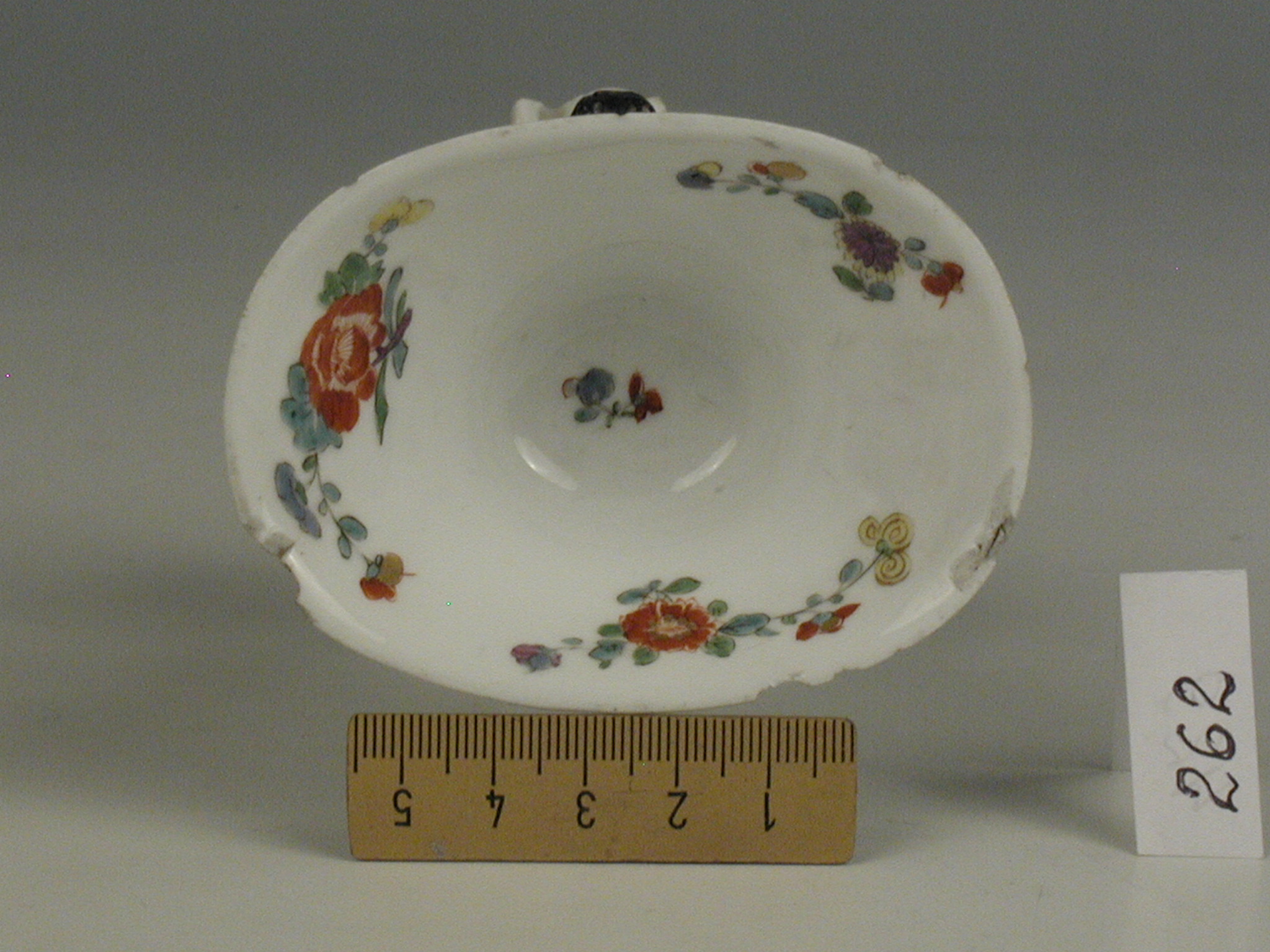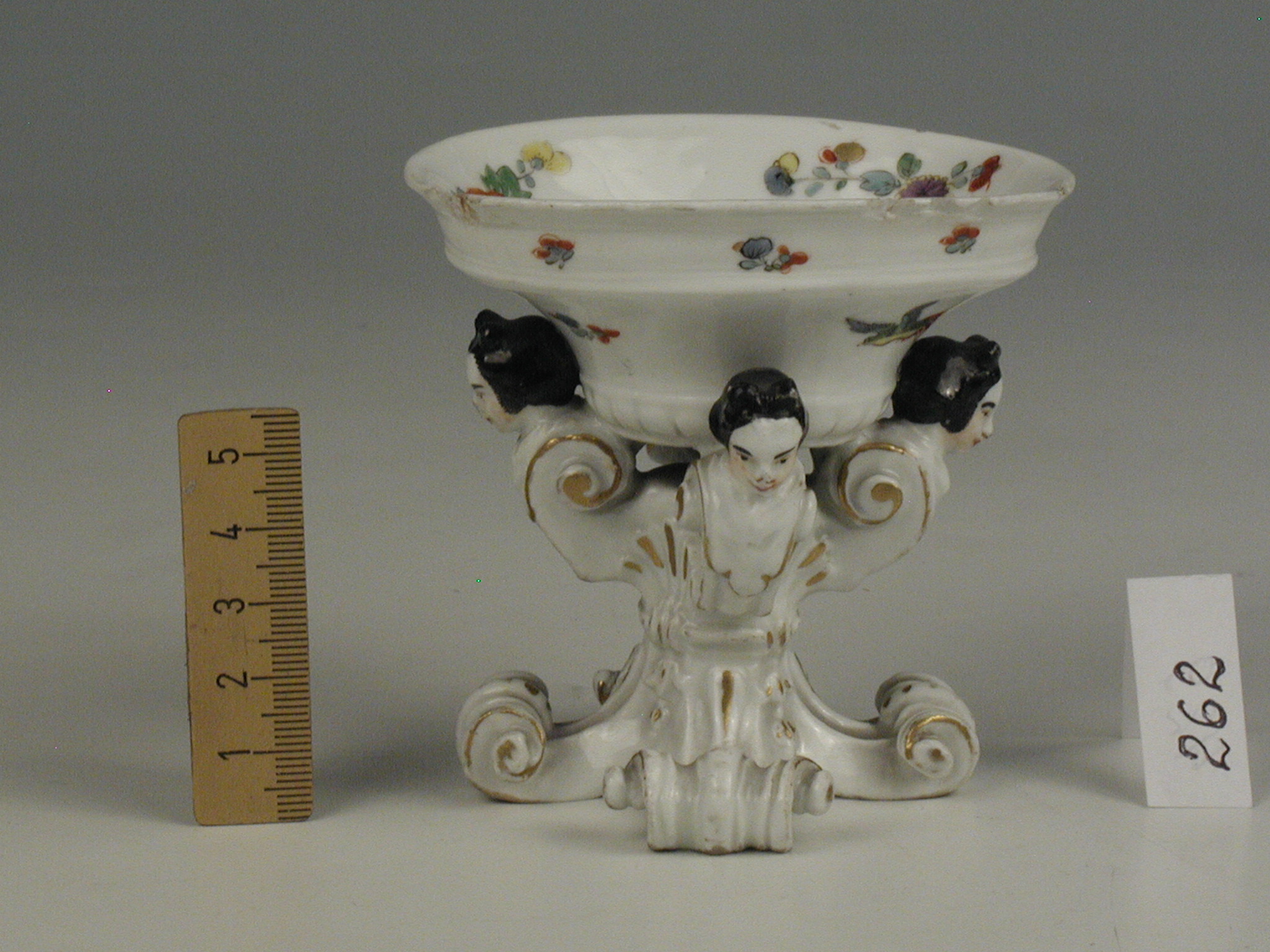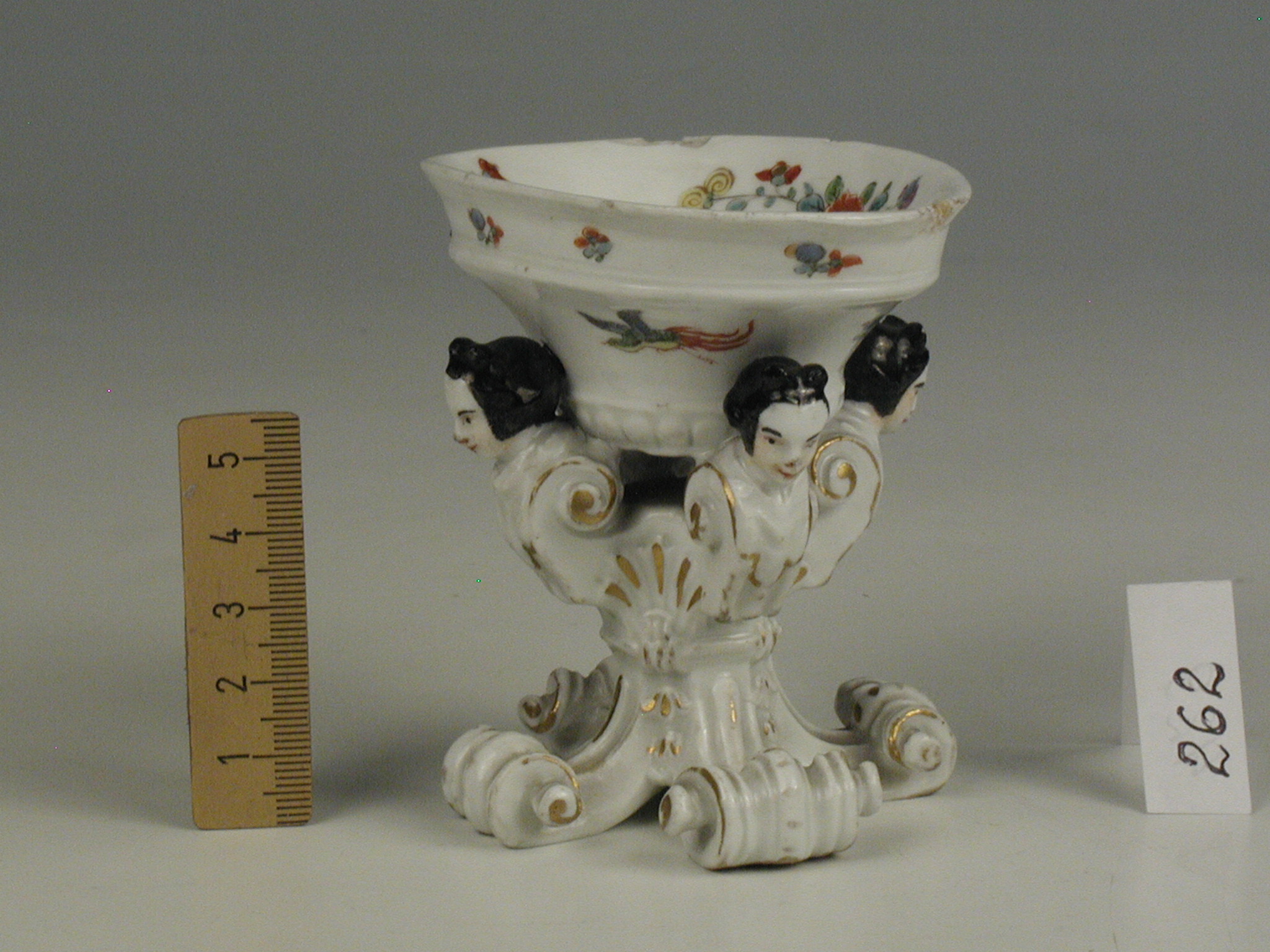 Авторські підписи, клейма: Марка синя підглазурна./Історія Атрибуціi: Консультація Соловєйчік Р.С. (Ермітаж, 1961 р.) - Мейсен, бл. 1730 р. (сільничка)/Кількість: 1/Опис: овальна, звужена донизу, яка лежить на чотирьох ніжках-волютах, з жіночими голівками у верхній частині; розпис, який наслідує східний, фарбами та золотом: з внутрішнього боку - стилізовані "індіанські квіти", з зовнішнього - окремі квіточки та птахи.