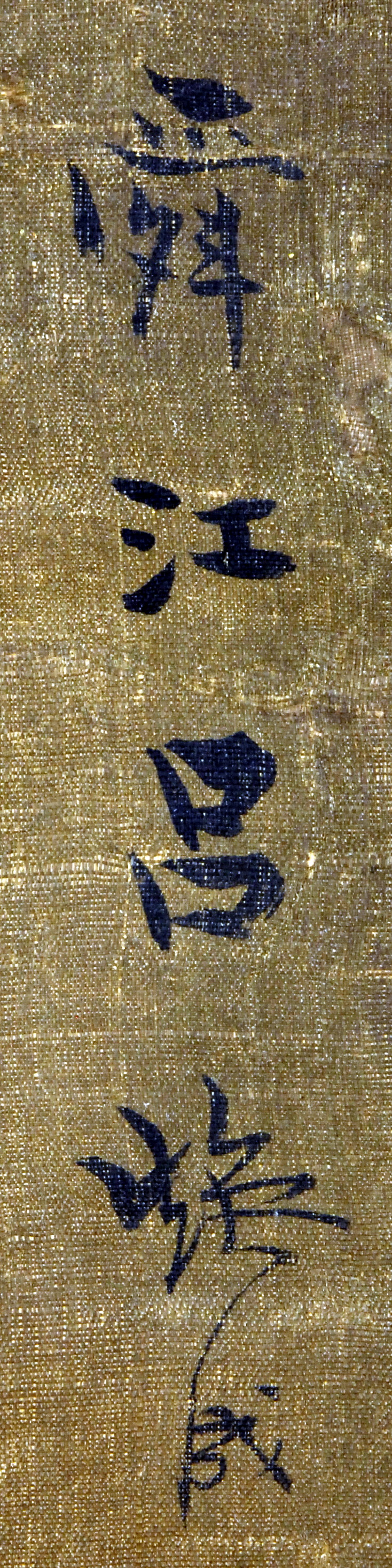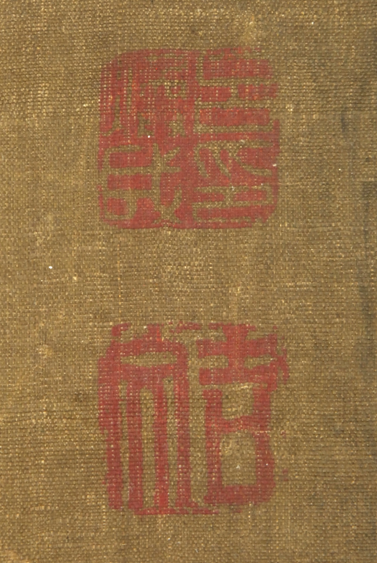 Комм.: На вертикальному сувої розташовані чотири фігури божеств, що уособлюють виконання побажань, народження численних достойних нащадків, довголіття та багатство і чиновницьку кар’єру. Божество щастя і чадоподавець (судячи за звичайними атрибутами цього персонажа, що включають м’яку шапку і жезл жу-і, а також за іконографічними рисами обличчя) зображений праворуч вгорі. На передньому плані праворуч стоїть Люй Дунбінь (за визначенням Ван Бінхуй) з накидкою з листя на плечах (атрибут відлюдника), чарівним гарбузом у правій руці та букетом у лівій. До букету входять гриби лінчжи (уособлення жіночої сутності та складова еліксиру безсмертя), орхідеї та гілка кориці з квітами. Вираз «аромат орхідей і пахощі кориці» означає «численне потомство» і «достойна людина». З гарбуза випадають вісім павуків: китайською «вісім павуків» співзвучно до «сто синів». На передньому плані ліворуч зображений бог довголіття – згорблений сивий чоловік із видовженим черепом. Він обіймає оленя – зображення оленя є побажанням вдалої чиновницької кар’єри. За богом довголіття на задньому плані стоїть бог багатства в чиновницькому головному уборі з червоною китицею і з пектораллю довголіття на шиї та грудях./Информацiя об оригiнале: Праворуч вгорі підпис «Люй Хуйчен з Шуньцзян» (Прочитано 2011 р. Логвин М.Ю.)/Історія Атрибуціi: 1) Липень 1933 – грудень 1943 Ван Бінхуй (Жозеф Вампінфи) визначив як твір Люй Хуйчен (1630-1705). «Її [роботи] сюжет, притаманний оберегам, вказує на ремісничий живопис. У будь-якому випадку, це охайна робота, деякі обличчя добре виконані, хоча лише старець, який сидить, притиснувши до себе оленя, має вираз на обличчі. Драпіровки холодні та умовні, [їхні] складки негнучкі та неживі, руки добре виконані.» (рукописний архів музею № 827 КЖ); 2) 1960 р. Музей Гугун, Ян Бода і Тянь Сю: «Оригінал»; 3) 1965 р. Інститут Історії Мистецтва МК СССР, Соколов С.Н.: «Живопис поганий, ремісничо, «народний майстер», можливо, [робота] копіїста з IV групи, кінець 18 – поч.. 19 ст.»; (інвентарна картка); 4) 2011 р. Логвин М.Ю. У підписі «Шуньцзян Люй Хуйчен» останні три ієрогліфи підпису «Люй Хуйчен» дуже схожі на оригінальний підпис (Zhong guo shu hua jia yin jian kuan shi стор. 400), проте серед відомих підписів відсутнє поєднання імені та прізвища художника з топонімом «Шунь Цзян»; печатки не збігаються з відомими чотирма печатками художника./Кількість: 1/Старі документи прийому: Дарча від 27.05.1959/ншi написи, штампи, печатки, етикетки, наклейки: Печатки «Печатка Люй Хуйчен»(білі ієрогліфи на червоному тлі) та «Цзі Вен» (червоні ієрогліфи на білому тлі з уривками червоної рамки). (Прочитано 2011 р. Логвин М.Ю.)
