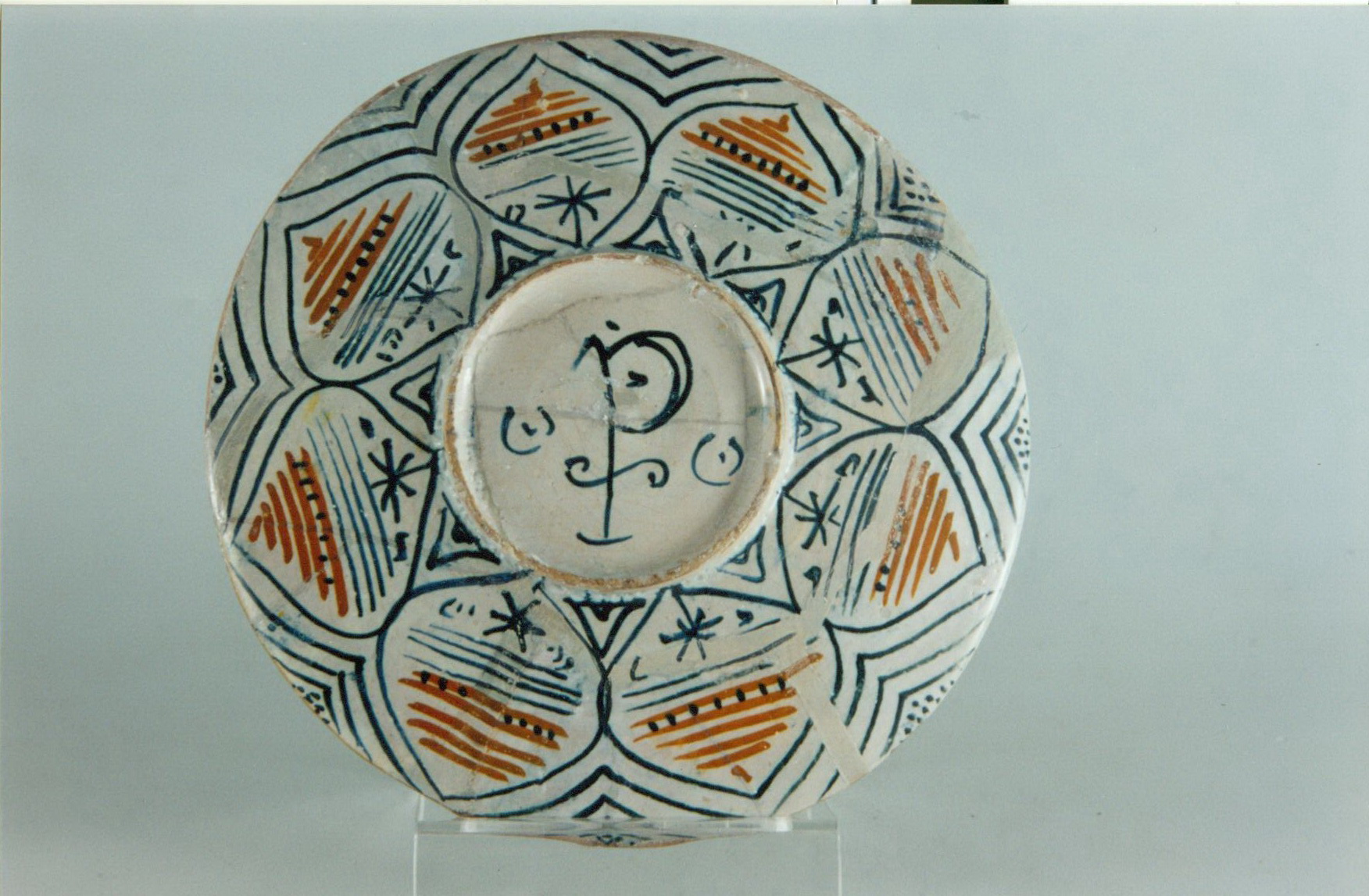 Додаток до назва (лист, ...): На денці жіночий портрет/Авторські підписи, клейма: На звороті характерний для Сієни розпис у вигляді восьми радіально розташованих пелюстків і марка Р з двома кружальцями по боках./Історія Атрибуціi: 1964 р. Михайлова Ольга Ернестівна (Державний Ермітаж): річ справжня, хороша. бл. 1500 р.