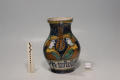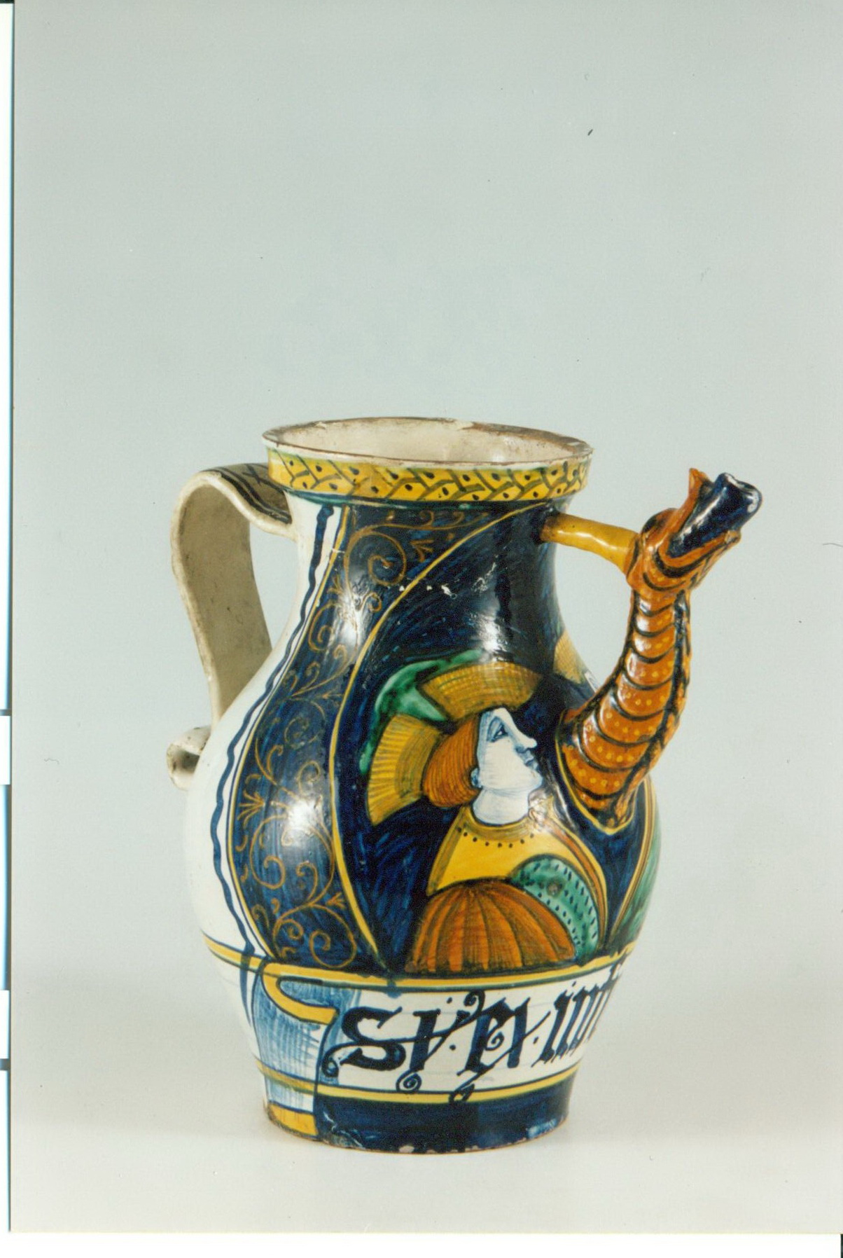 Закладка “Атрибуція” - Наим. предмета, издания: Аптечний глечик (orciuolo)/Змiн.додаток до назва (лист, ...): Аптечний глек із носиком у вигляді голови дракона та профільними чоловічимі портретами з обох боків від носика./Змiн.опис: Глек з широкою ручкою та носиком у вигляді голови дракона на довгій лускуватій шиї, яка з'єднується з корпусом перемичкою. Обабіч носика, обрамлені смугою рослинного орнаменту, два чоловічих портрета на темно-синьому тлі. Під портетами на сувої напис готичними літерами: Sir infuo'e (рідкий сироп). Фарби сині, жовті, жовтогарячі, зелені по білій поливі./Змiн. час створення: перша половина XVI ст. (каталог рославець О.М. 2003 р.)Новый материал: майолікамісце створення, школа: Кастеллі