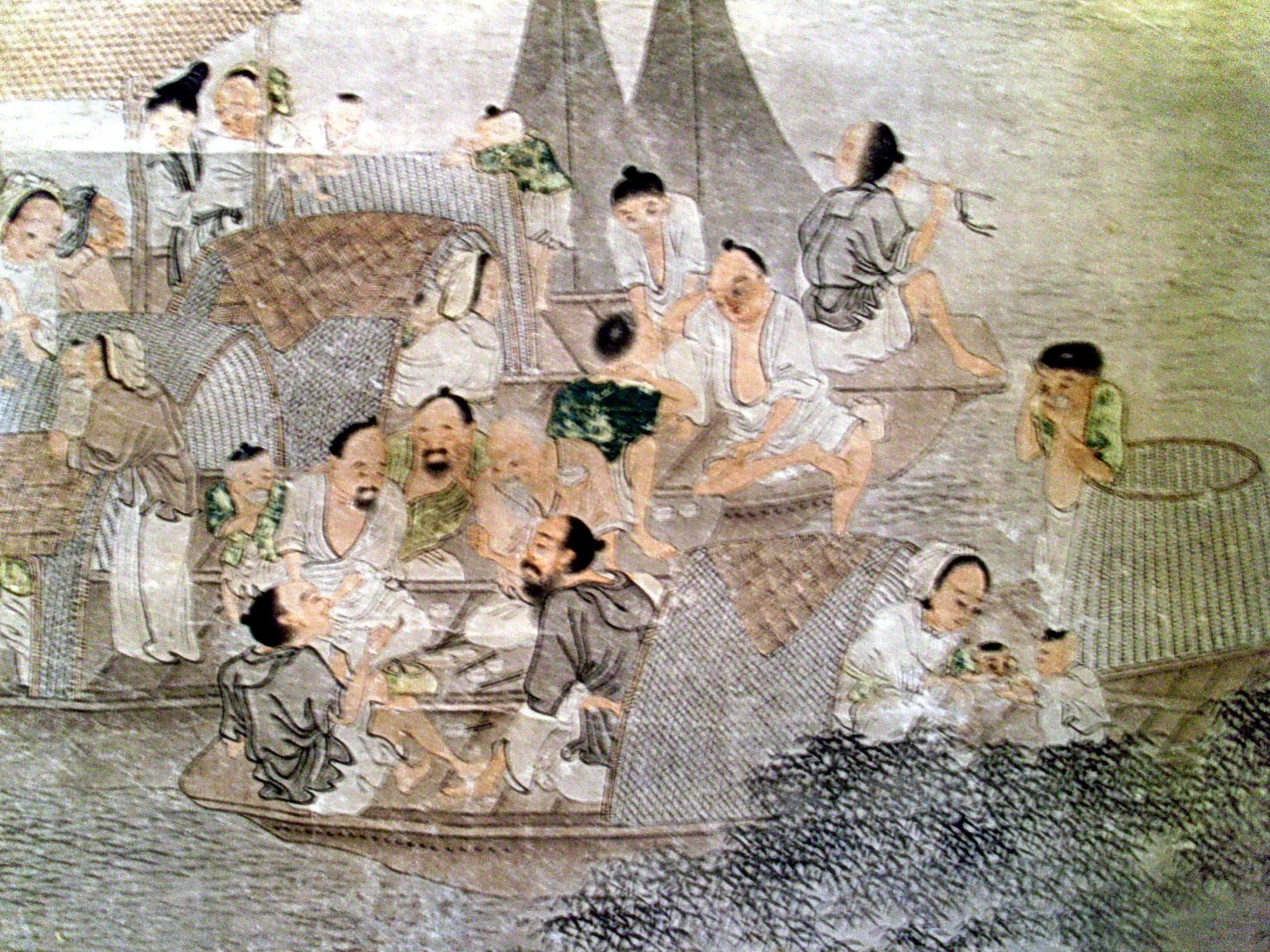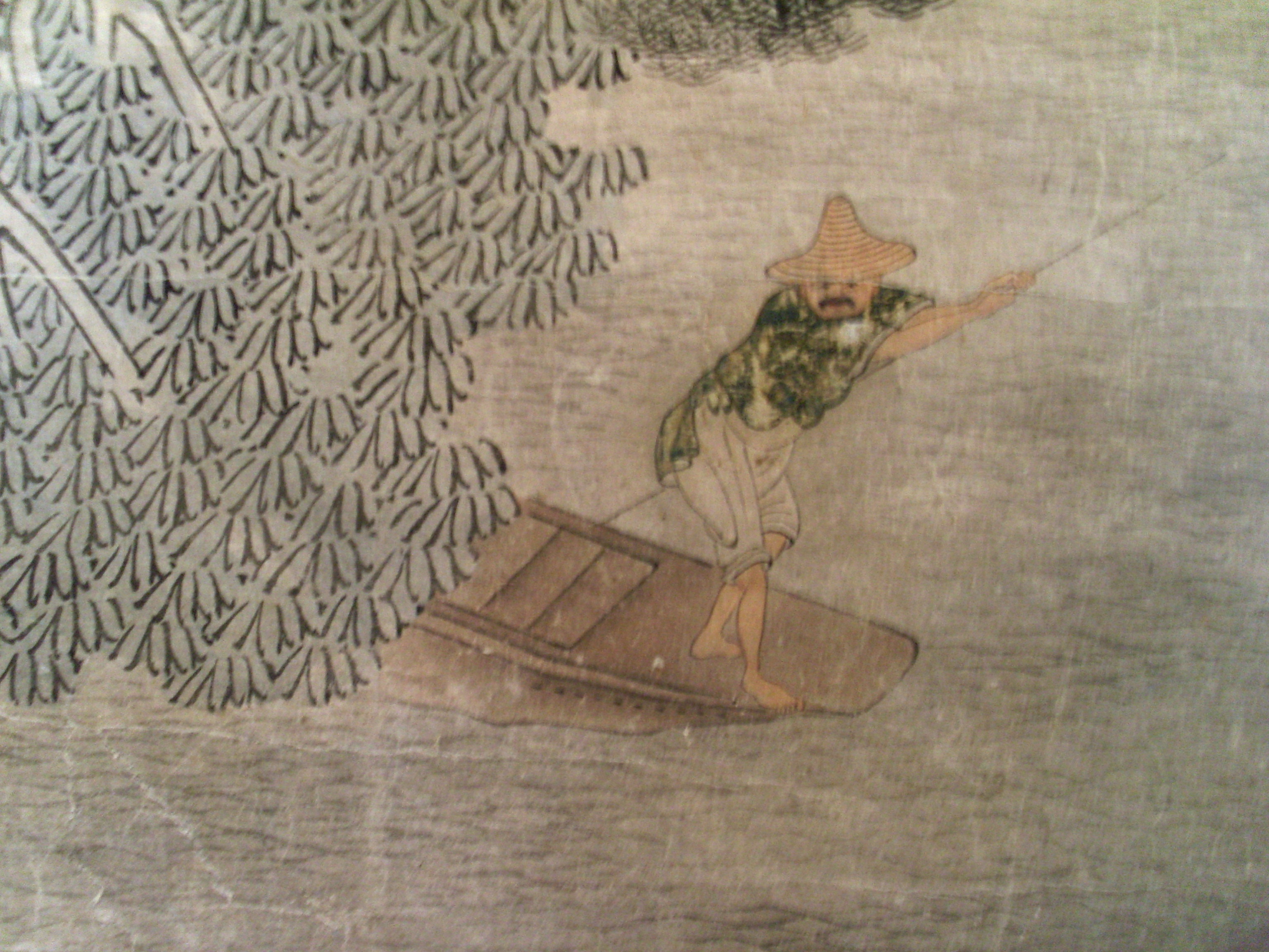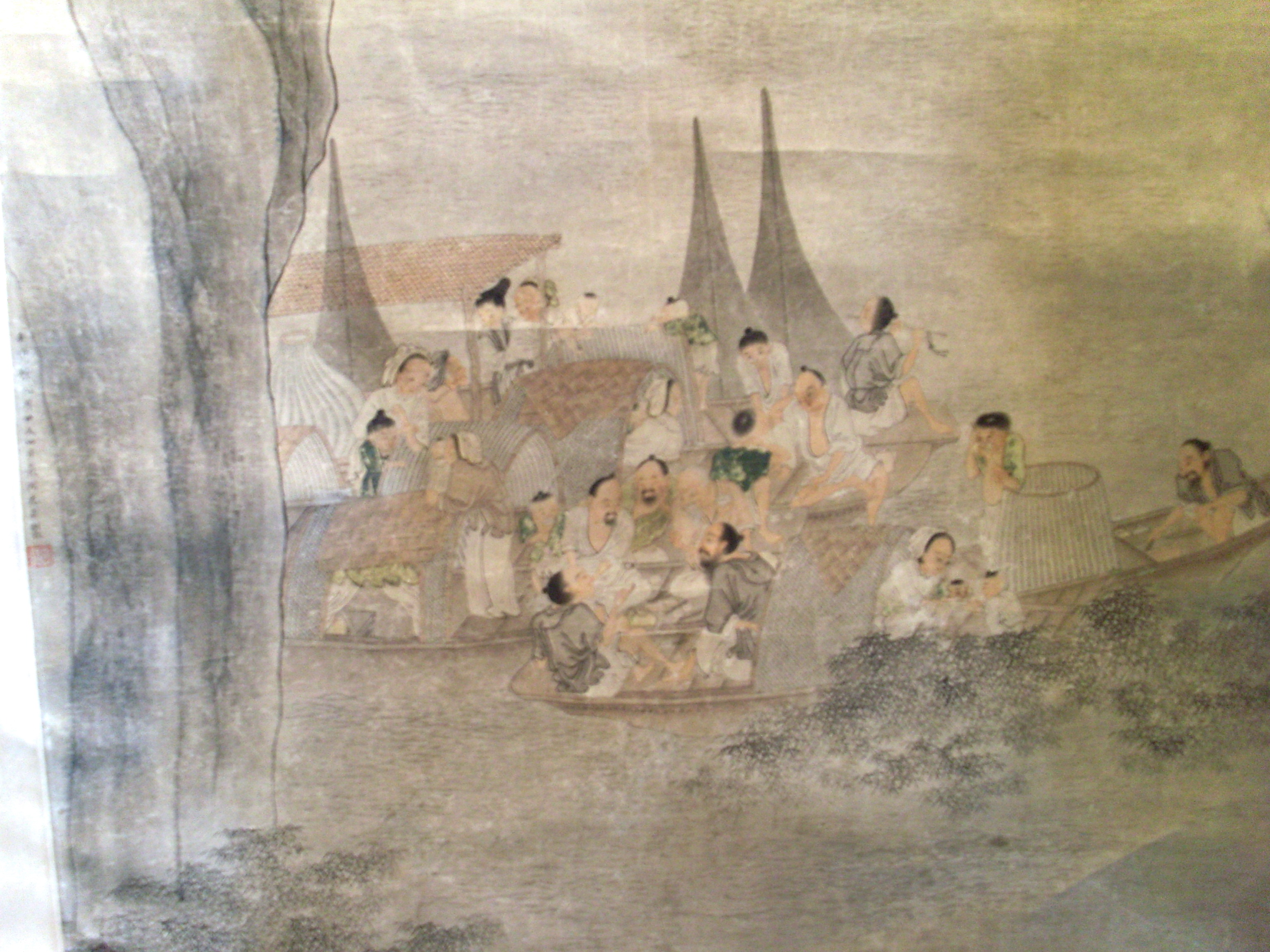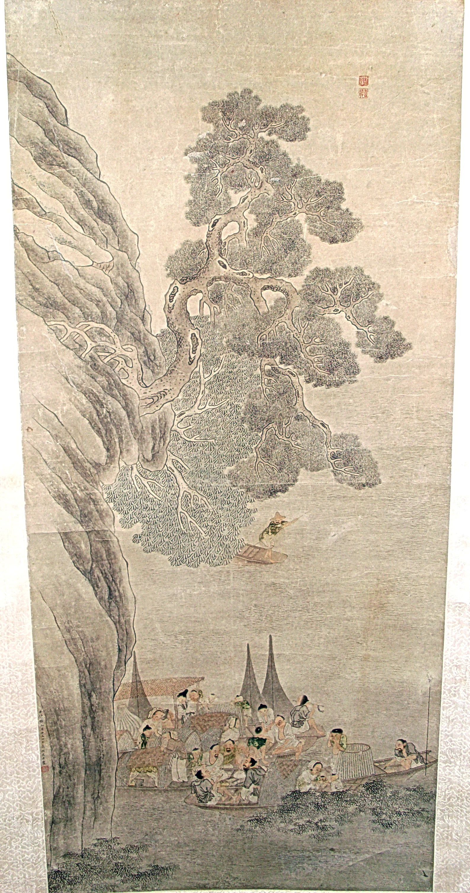 Історія Атрибуціi: 1) Липень 1933 – грудень 1943 Ван Бінхуй (Жозеф Вампінфи) визначив як твір Ю Цю (працював бл. (рукописний архів музею 576 КЖ); 2) 1963 Музей Гугун (Ян Бода і Тянь Сю) «Ю Цю?» 3)1965 Інститут Історії Мистецтва МК СРСР (Москва) Соколов С.Н.: «Початок 20 ст., наслідування Ю Цю.» (інвентарна картка)/Кількість: 1/Старі документи прийому: Дарча від 27 травня 1959 р./Опис: Вздовж всього лівого краю вертикального сувою зображено високу скелю. З неї у верхній третині виростає сосна з великим покрученим корінням і покрученими гілками, яка нависає над водою. З-за сосни видно половину човна, на якому стоїть чоловік з веслом, у солом’яному брилі. На передньому плані на воді стоять три човни зі щільно притуленими один до одного бортами. На човнах зібралися рибалки з родинами, які діляться їжею, чаюють, годують дітей, грають на флейті.