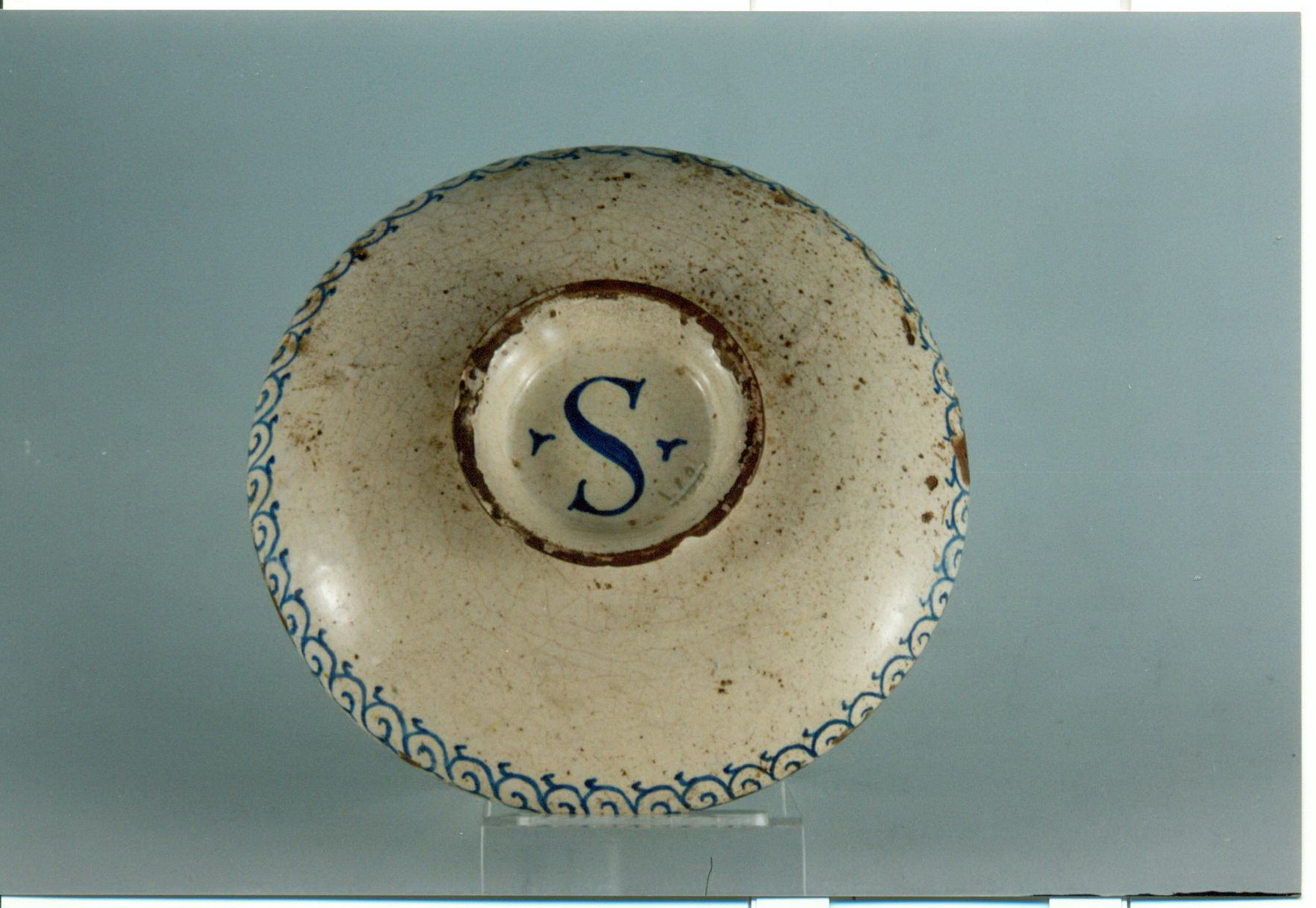 На зворотньому боці, по краю борта, проходить орнаментальна смуга із спиралевидних завитків. В центрі ніжці зобюражно синю літеру S між двома крапками.