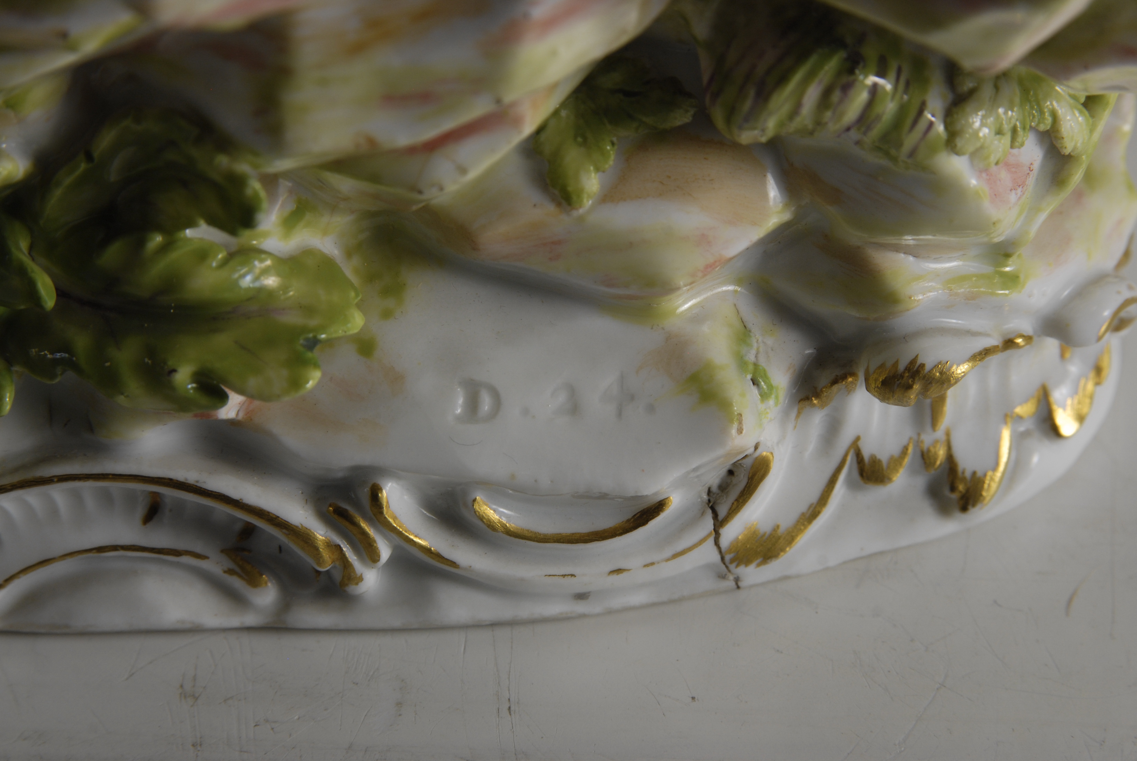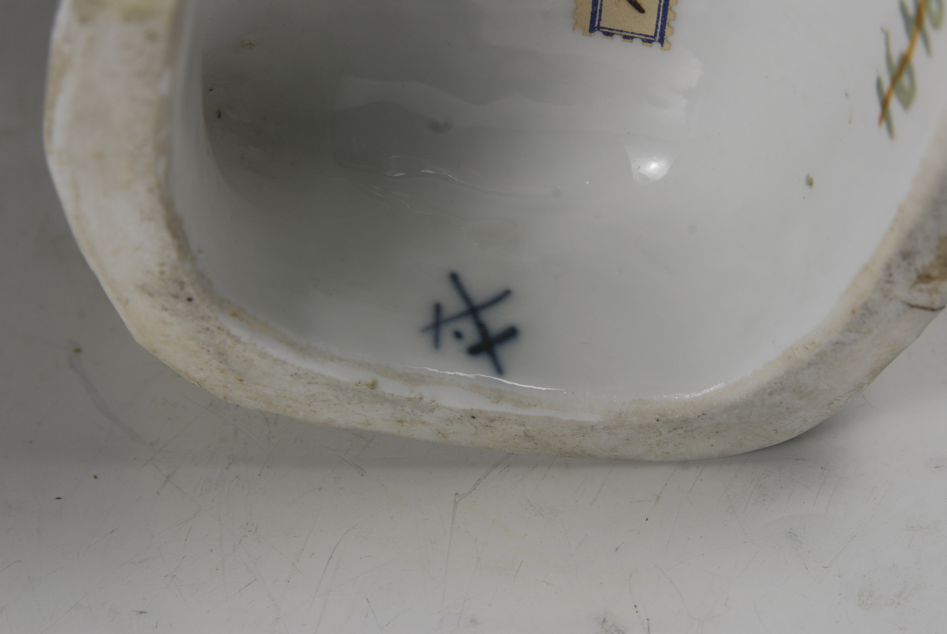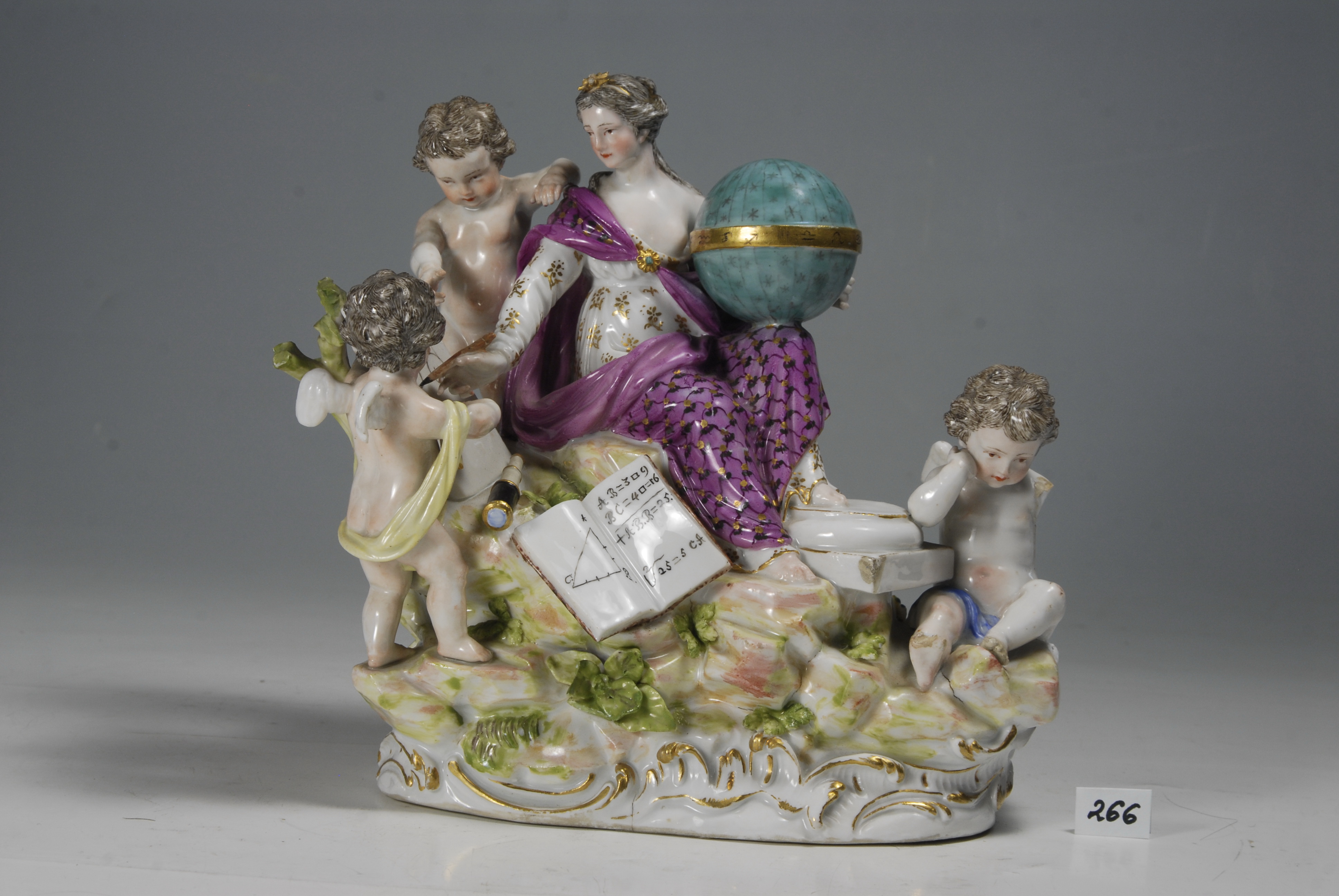 Авторські підписи, клейма: Марка синя підглазурна: схрещені мечі. На підніжжі ззаду вдавлені в тісто літера "D" та цифра "24"/Історія Атрибуціi: Консультація Соловєйчік Р.С. (Ермітаж, 1961 р.) - Мейсен, 1763 - 74 (Алегорія наук)/Опис: група з чотирьох фігур. У центрі молода жінка з зеленкувато-блакитною сферою на колінах, яка сидить; на ній біла сукня, розписана золотими гілочками та темно-лиловий плащ, скріплений на грудях брошкою. Вона креслить геометричні фігури на дошці, яку підтримує амур у жовтому плащі на стегнах; з заду стоїть оголений амур, що вказує правою рукою на дошку; біля ніг жінки - третій амур, що сидить на голубому плащі, спираючись на постамент колони. На підніжжі книга з геометричними формулами та підзорна труба. Підніжжя у вигляді скелі, розписане коричневою і зеленою фарбами та прикрашене ліпним листям; по краю рельєфні з золотом рокайлі.