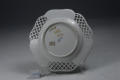 1971р. Ганс Больц (дирекція промислового та торгового банку НДР): 1740-і рр. Розпис років на 20 пізніше./Кількість: 1/Опис: з хвилястим краєм. По борту чергуються поля у вигляді прорізного плетення з рельєфними незабудками на перехрестях та глухих з рельєфними квітучими гілками; розпис фарбами: три хвилясті гірлянди дрібних квіточок, які зєднуються в центрі, та окремі квіточки між ними. По краю відводка золотом.