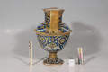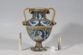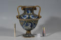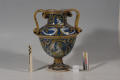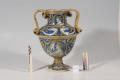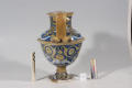 Закладка “Атрибуція” - Змiн.додаток до назва (лист, ...): Ваза з профільними портретами чоловіка та жінки з обох боків тулуба (каталог О.М. Рославець 2003 р.)/Змiн.опис: Ваза з тулобом овоїдної форми, з високою циліндричною щийкою, з двома ручками, що закінчуються завитками. Тулуб декоровано стилізованим рослинним орнаментом та двома профільними портретами чоловіка та жінки у медальйонах, з обох боків тулуба. На шийці також два профільні портрети чолвіків. На раменах гротескові фігури тварин з головами коней. Розпис у вохристо-жовтих тонах з білилом та монохромним люстром по синьому тлу.Новый материал: майоліка