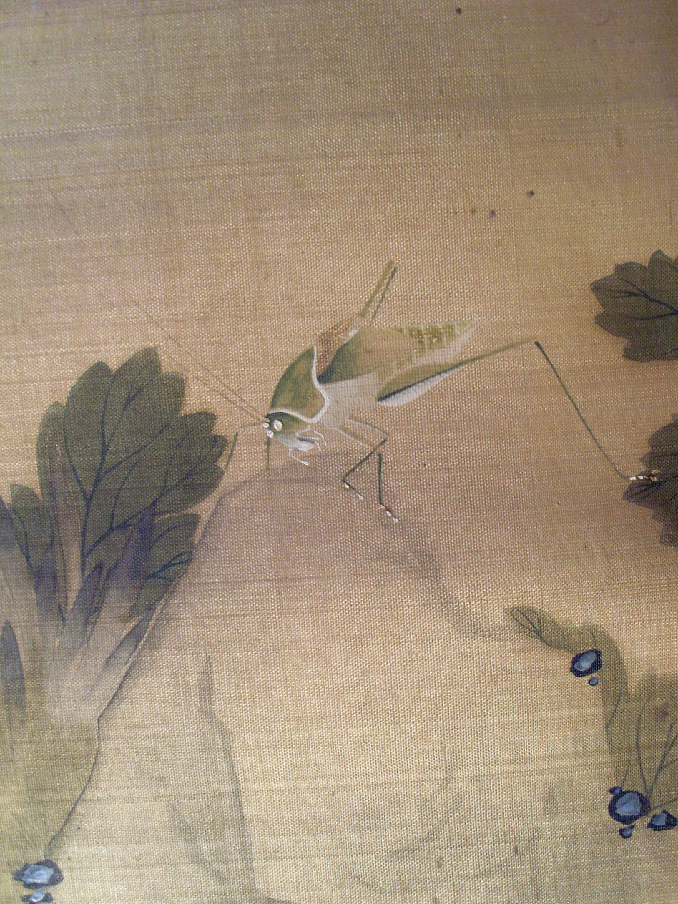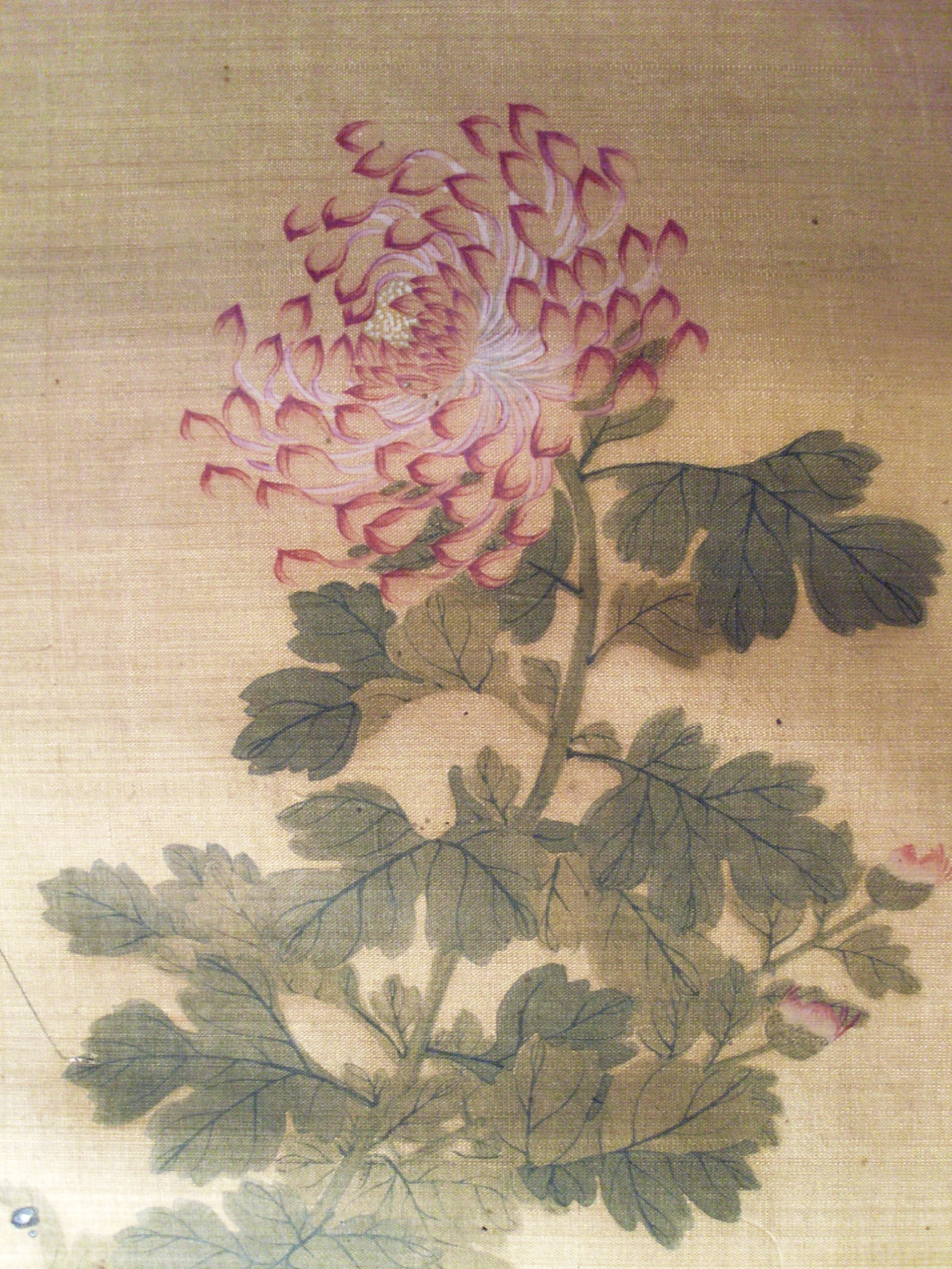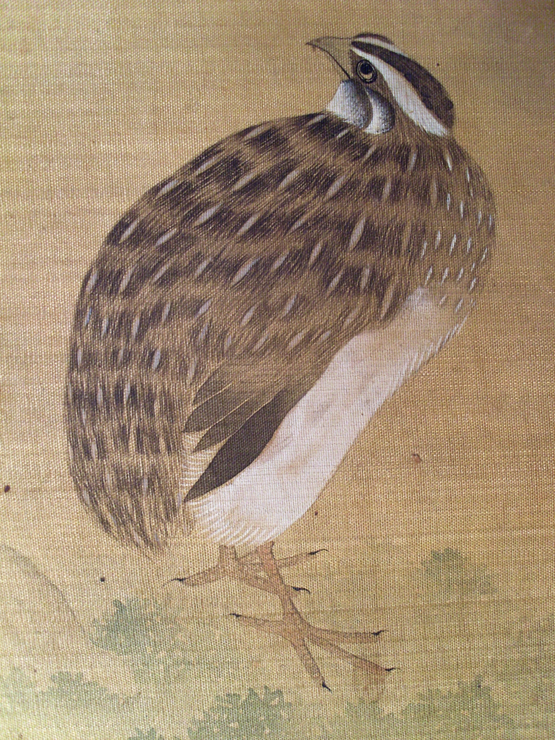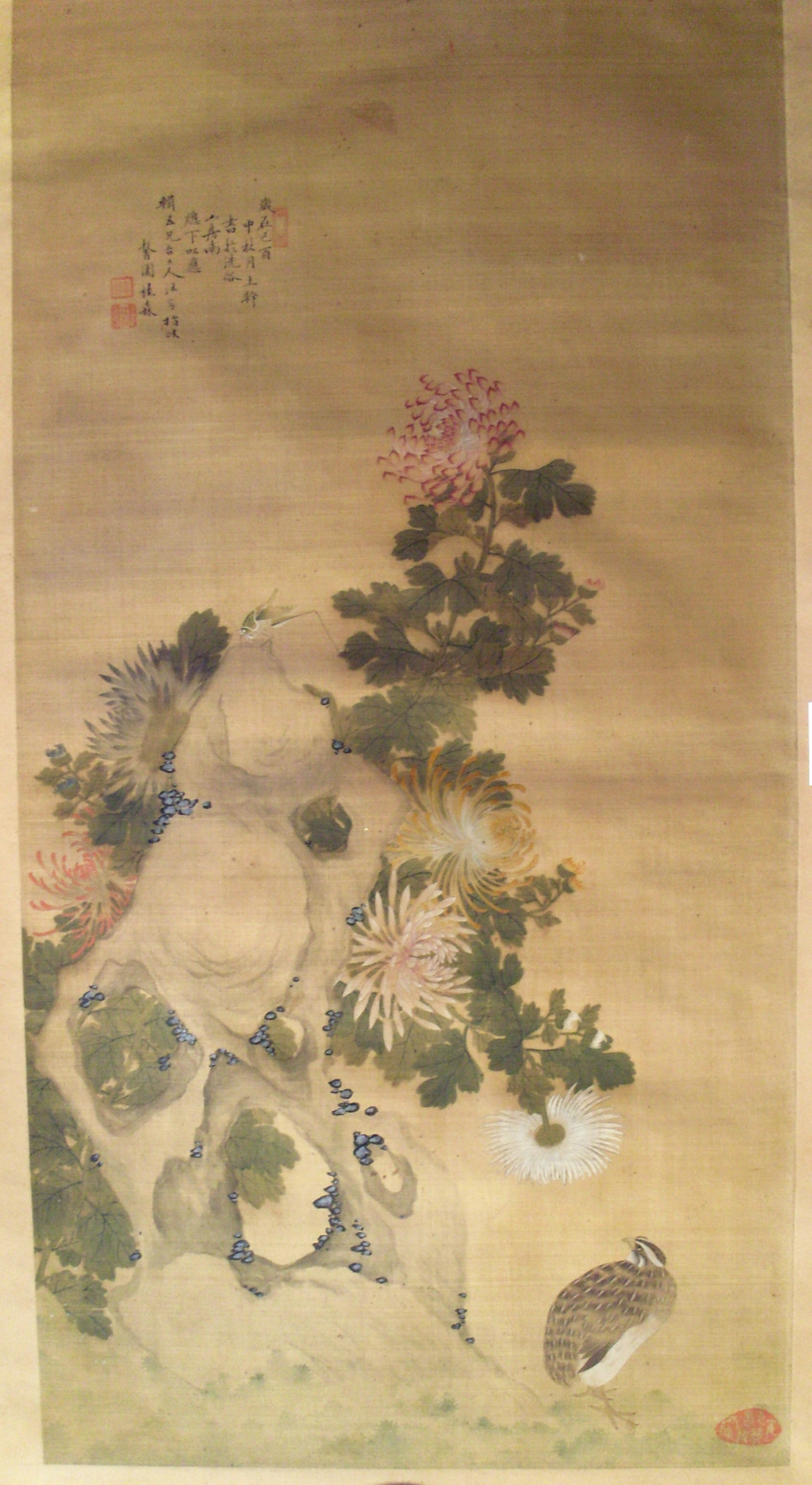 馨園桂森/Історія Атрибуціi: 1) Липень 1933 – грудень 1943 Ван Бінхуй (Жозеф Вампінфи) визначив як твір Гуй Сень (рукописний архів музею 939 КЖ); 2) 1965 Інститут Історії Мистецтва МК СРСР (Москва) Соколов С.Н.: «Правильне ім’я [художника] – Гуй Сень. Досить тонке виконання, оригінал.» (інвентарна картка) 3) Прочитано напис із датою і псевдонімом майстра. Див. "Опис" (М. Логвин 2021)/Кількість: 1/Старі документи прийому: Дарча від 27 травня 1959 р./Історія предмета, легенда: Придбано (отримано в подарунок?) подружжям Жаспар (Таїсія Павлівна Жаспар і Андре Стефан Жаспар) у Шанхаї з 1928 по 1948 р./Опис: Праворуч внизу на сувої зображено куріпку, тіло якої обернене у профіль праворуч, а голова – ліворуч. Куріпка дивиться на кущ хризантем з великими різнокольоровими квітами, який виростає з-за великої брили ажурного валуна з блакитно-зеленими купками моху, схожими на «самоцвіти», і височіє над валуном, займаючи, разом із ним, весь лівий бік композиції. На вершечку валуна сидить коник у стадії розвитку "німфи" (тобто ще не доросла особина). Сувій містить віршований підпис і дві печатки автора у лівому верхньому кутку. Праворуч від куріпки, у правому нижньому кутку сувою знаходиться ще одна (авторська?) печатка, яка абрисами нагадує камінець неправильної форми./ншi написи, штампи, печатки, етикетки, наклейки: Нижче підпису стоять дві іменні печатки автора: «Сінь Юань» (рельєфом: червоні ієрогліфи на білому тлі) і «Справжня печатка Ґвей Сень» (у поєднаній техніці рельєфу посередині та intaglio з двох боків)