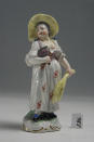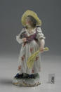 Закладка “Атрибуція” - Змiн. розміри: висота 14,7/Змiн. Написи, клейма, марки: марка синя підглазурна: монограмма з літер "СТ" під короною та цифри "77"/Змiн.опис: Жниця, яка стоїть з серпом у правій руці та жмутом колосся у лівій; на нії біла спідниця, розписана червоними квіточками, ліловий корсаж, жовтий крислатий капелюх з синьою стрічкою, та чорні черевики з синіми бантами. Підніжжя з рельєфними тронутими золотом рокайлями./Змiн. час створення: 1777 р.Новый материал: порцелянаИзм. техника: надглазурний поліхромний розписИзм. техника: золочення