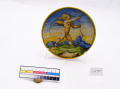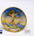 Додаток до назва (лист, ...): Тарілка маленька з пласким вузьким бортом. Вся поверхня декрована зображеннмя пейзажу та фігури Амура з сурмою у руках./Історія Атрибуціi: В записах Ханенка вважався як вироб Пезаро
