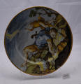 Закладка “Атрибуція” - Змiн.опис: Блюдо з вузьким бортом та поглибленим денцем. Всю поверхню вкрито розписом на сюжет із Старого завіту про Давида та Голіафа. Зображено момент вбивства Голіафа. На каменях лежить вбитий Голіаф, поруч стоїть Давид з піднятими вгору у молитовному жесті руками.