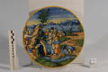 Додаток до назва (лист, ...): Тарілка невелика із поглибленим денцем, декорована поліхромним розписом. На звороті, на денці напис: "Moise precote la pietra"/Авторські підписи, клейма: На звороті три концентричних кола і надпис синьою фарбою Moise precote la pietra (Мойсей ударяє камінь)/Історія Атрибуціi: Вважалась виробом Урбіно/Кількість: 1