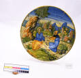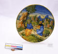 Додаток до назва (лист, ...): Тарілка глибока з широким пласким бортом. Декорована поліхромним розписом із зображенням Христа, який сидить під скелєю, поруч з ним Сатана, який подає йому камень/Історія Атрибуціi: Вважалась виробом Урбіно/Кількість: 1