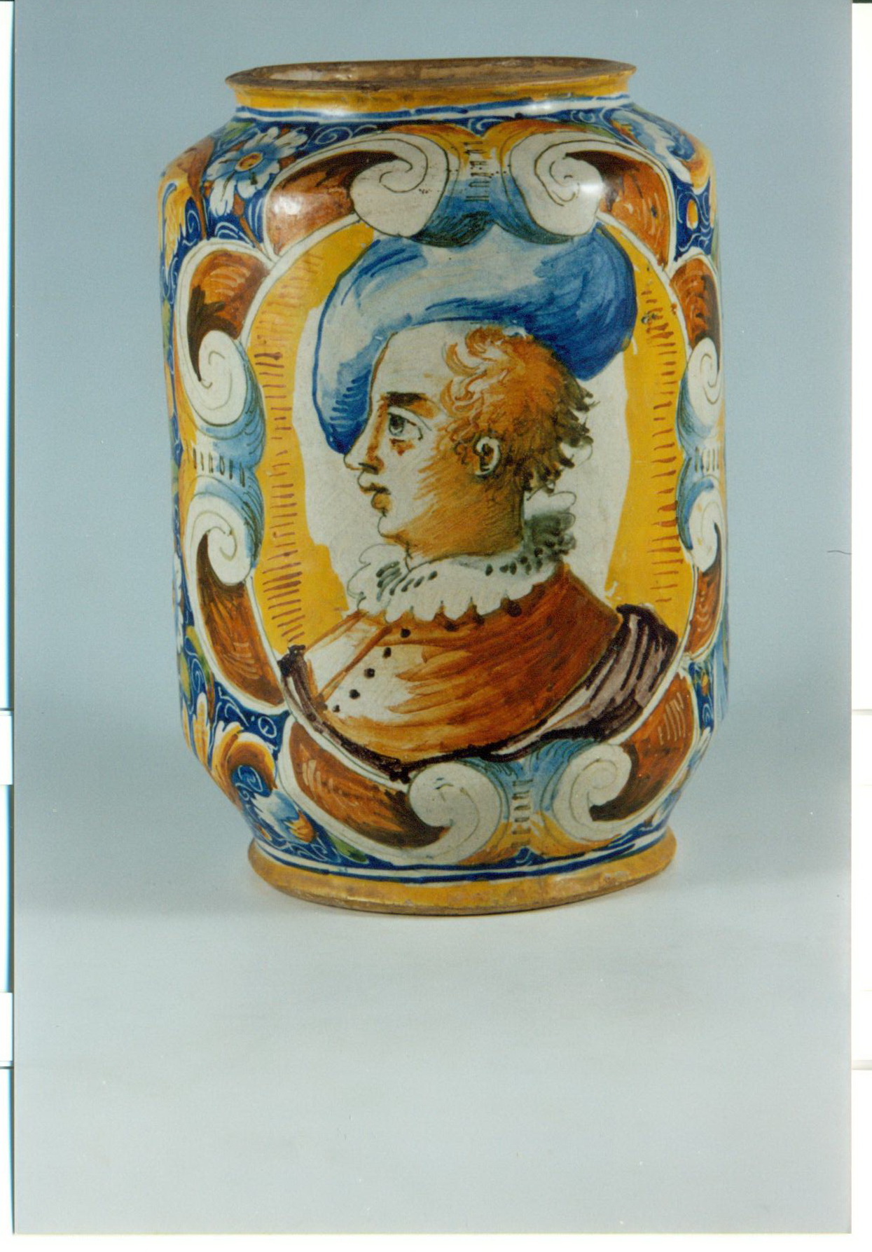 Закладка “Атрибуція” - Наим. предмета, издания: Аптечнй дзбан (альбарелло)/Змiн. Написи, клейма, марки: Біла квітка (ромашка або маргаритка) з жовтою серединкою вважється знаком майстрені Доменіко да Венеція./Змiн.опис: Альбарелло високе на низькій ніжці, циліндричної форми з широким невисоким горлом. Тулуб вкрито рослинним орнаментом із листя аканта та шестипелюсткових квітів по синьому тлу. Обабіч, у великих овальних медальйонах з валютоподібними завитками, погрудні профільні зображення юнака у береті та військового у шоломі.