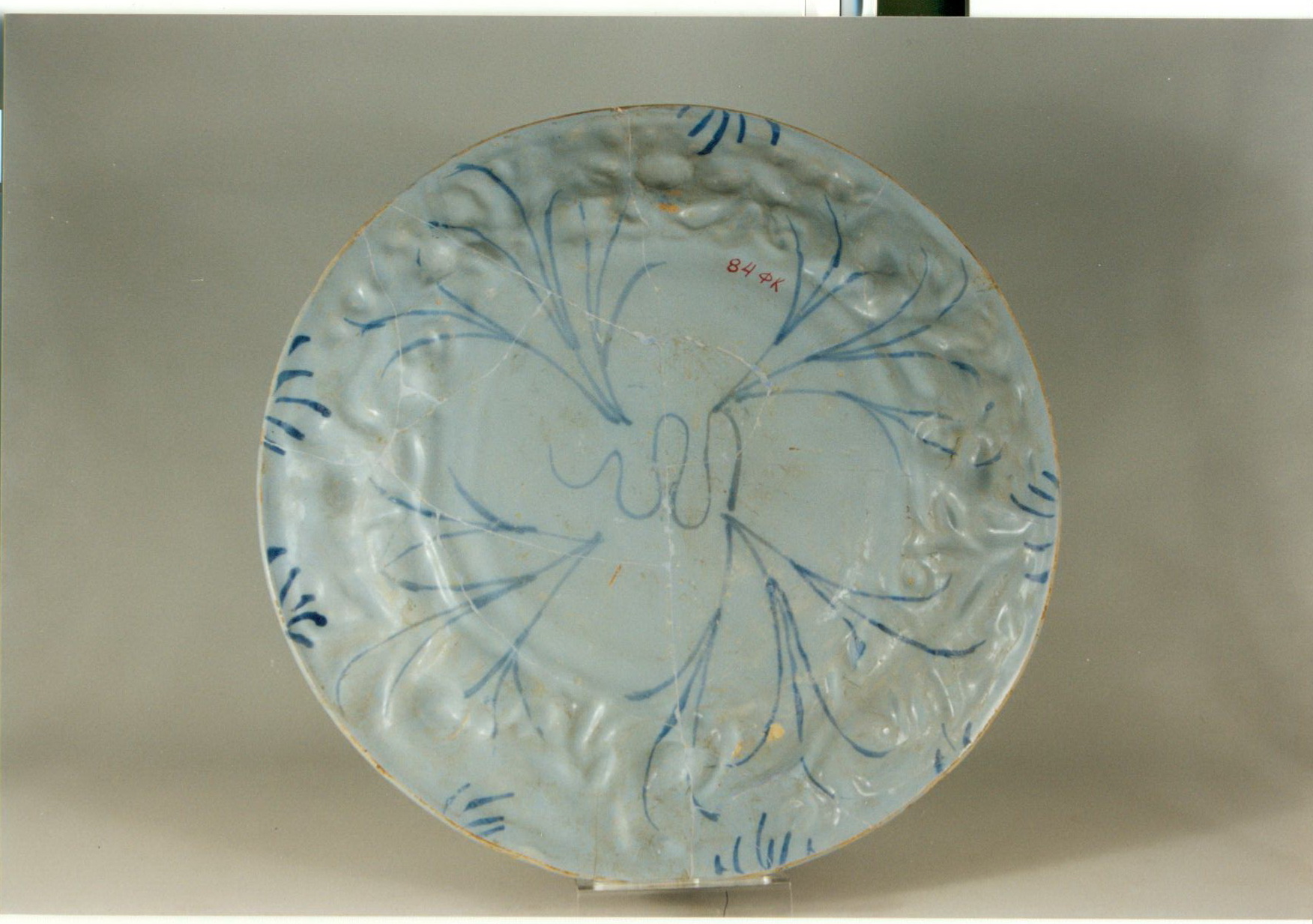 Додаток до назва (лист, ...): кругле з широким бортом, декорованим рельєфним рослинним орнаментом. На денці зображено юнака, який сидить на пагорбі/Історія Атрибуціi: 1964 р. Михайлова Ольга Ернестівна (Державний Ермітаж): Північна Італія, 18 ст. (Венеція?)