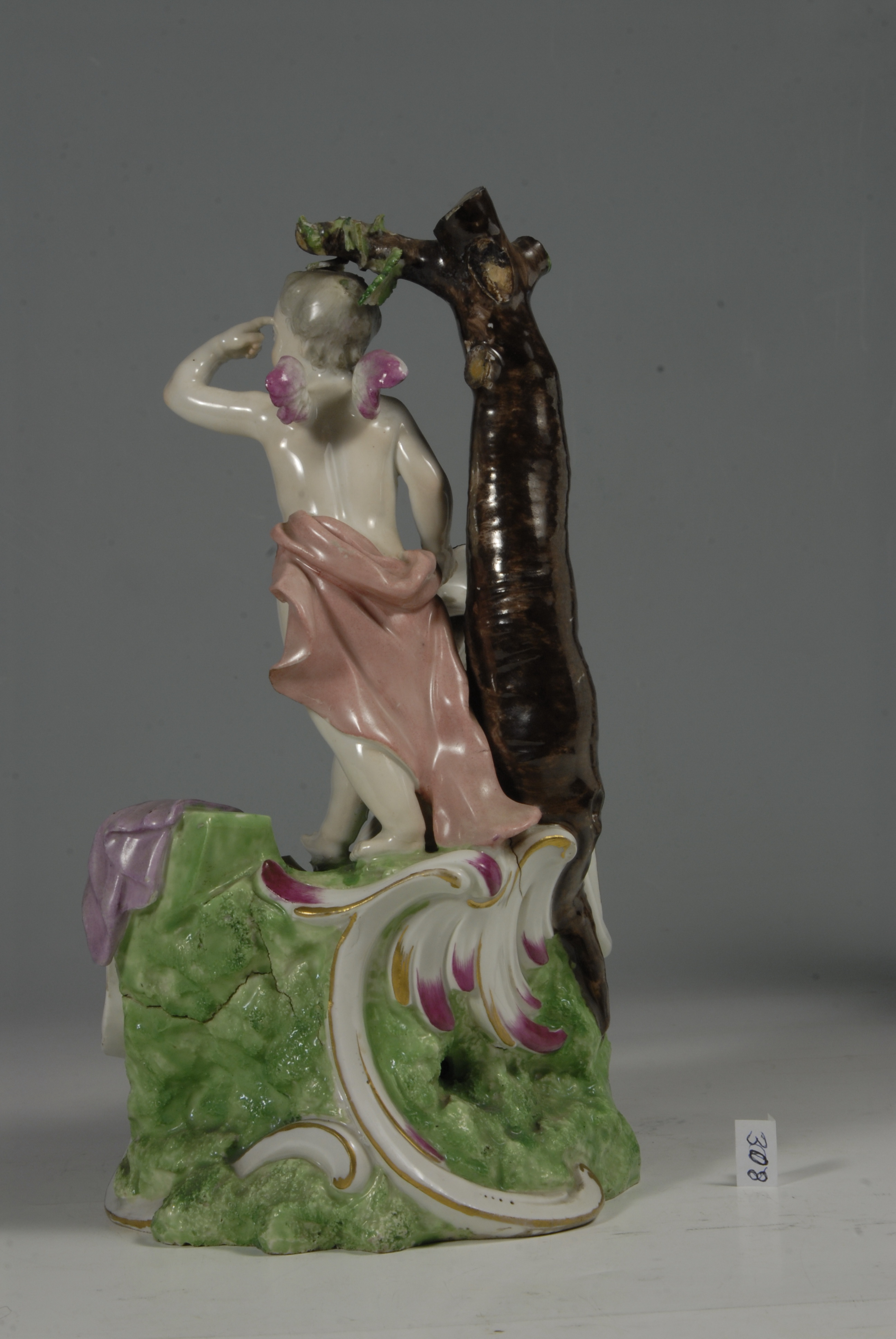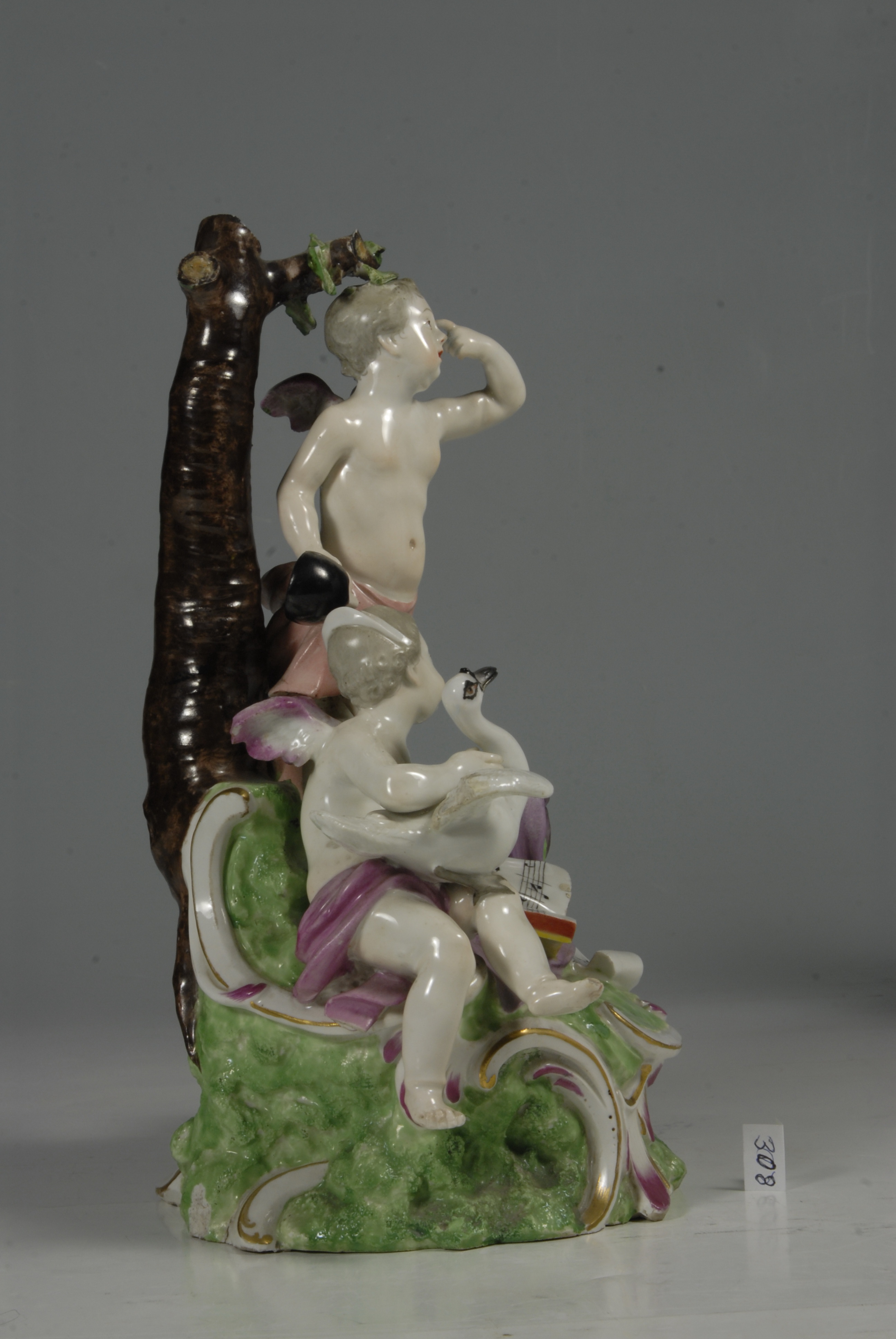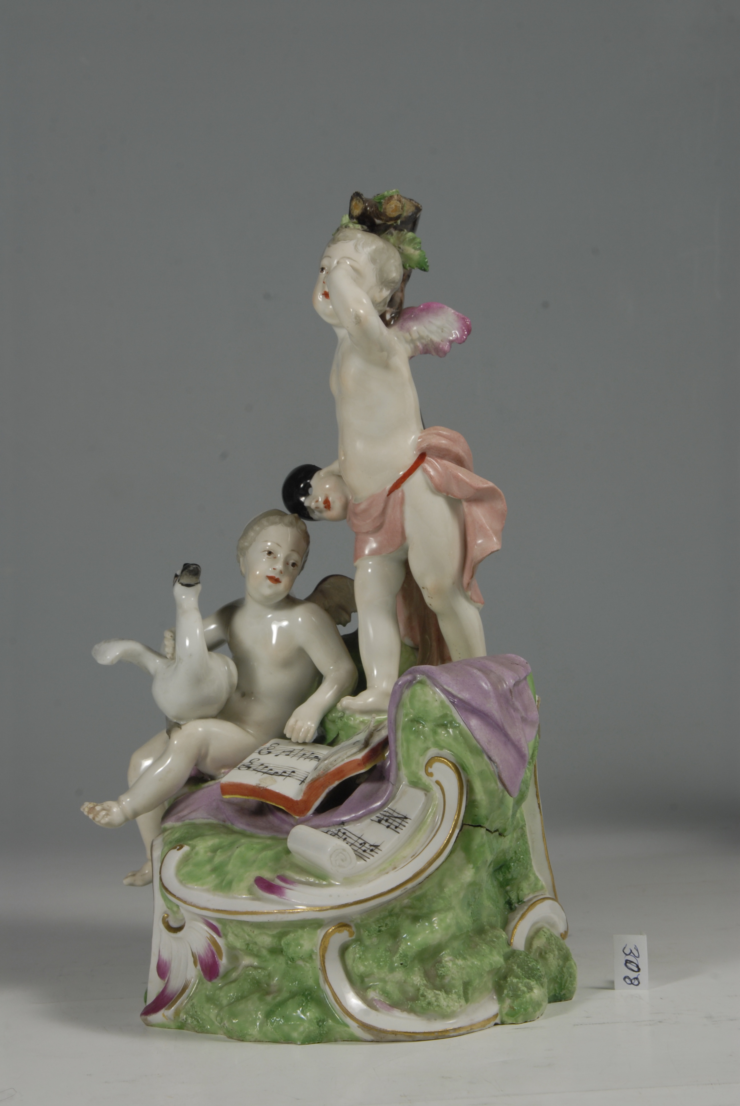 Закладка “Атрибуція” - Змiн.опис: Група з двох дітей-амурів біля високого коричневого стовбура дерева. Один з амурів сидить з гусаком на колінах, його стегна прикриті лиловим плащем; інший амур стоїть з маскою у правій руці, піднявши ліву руку до лоба; на його стегнах рожевий плащ; біля його ніг, на підніжжі, лежить розкритий нотний зошит, під яким - бузковий плащ. Підніжжя високе, зелене з рельєфними золоченими рокайлями./Змiн. час створення: 1760-і рр.