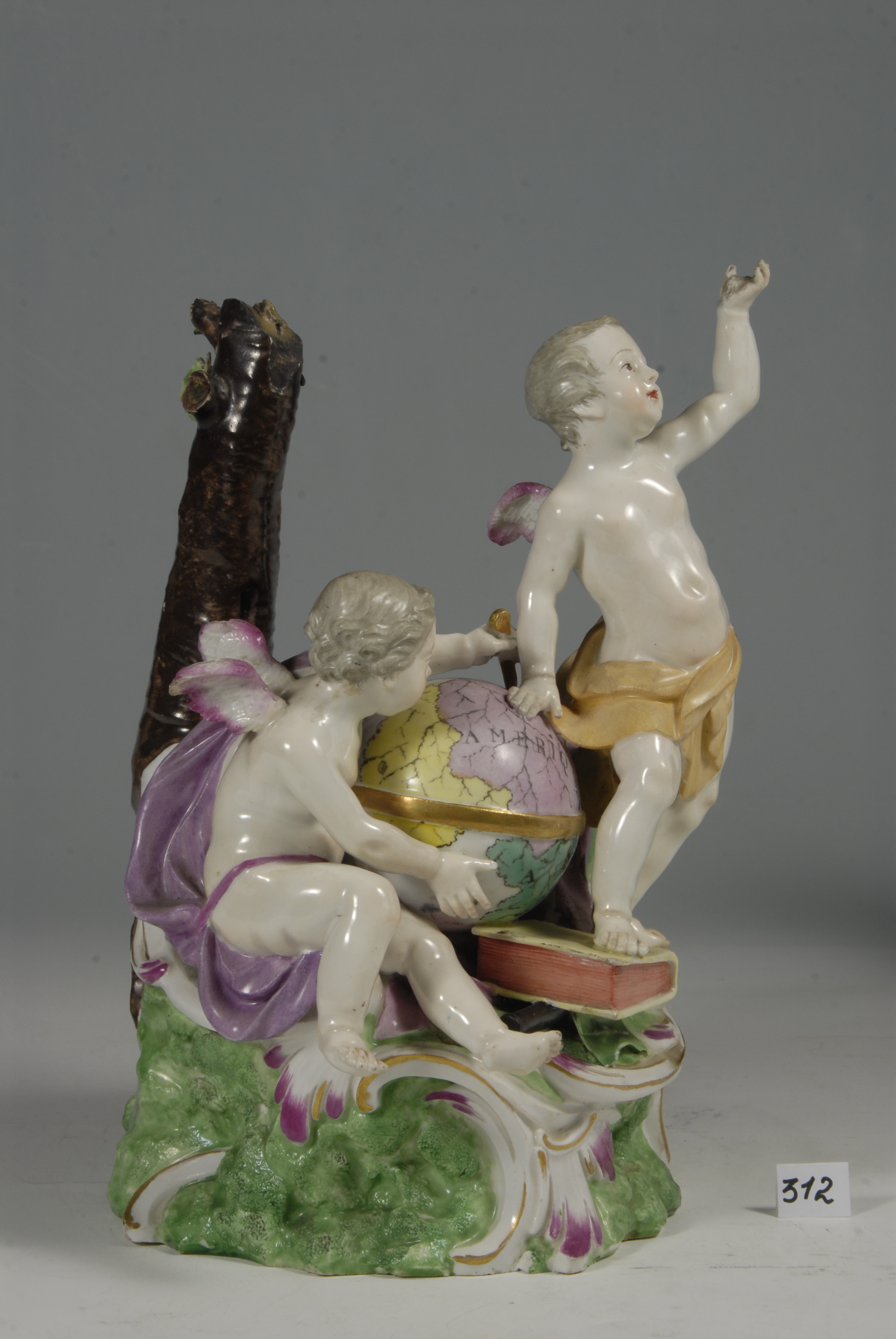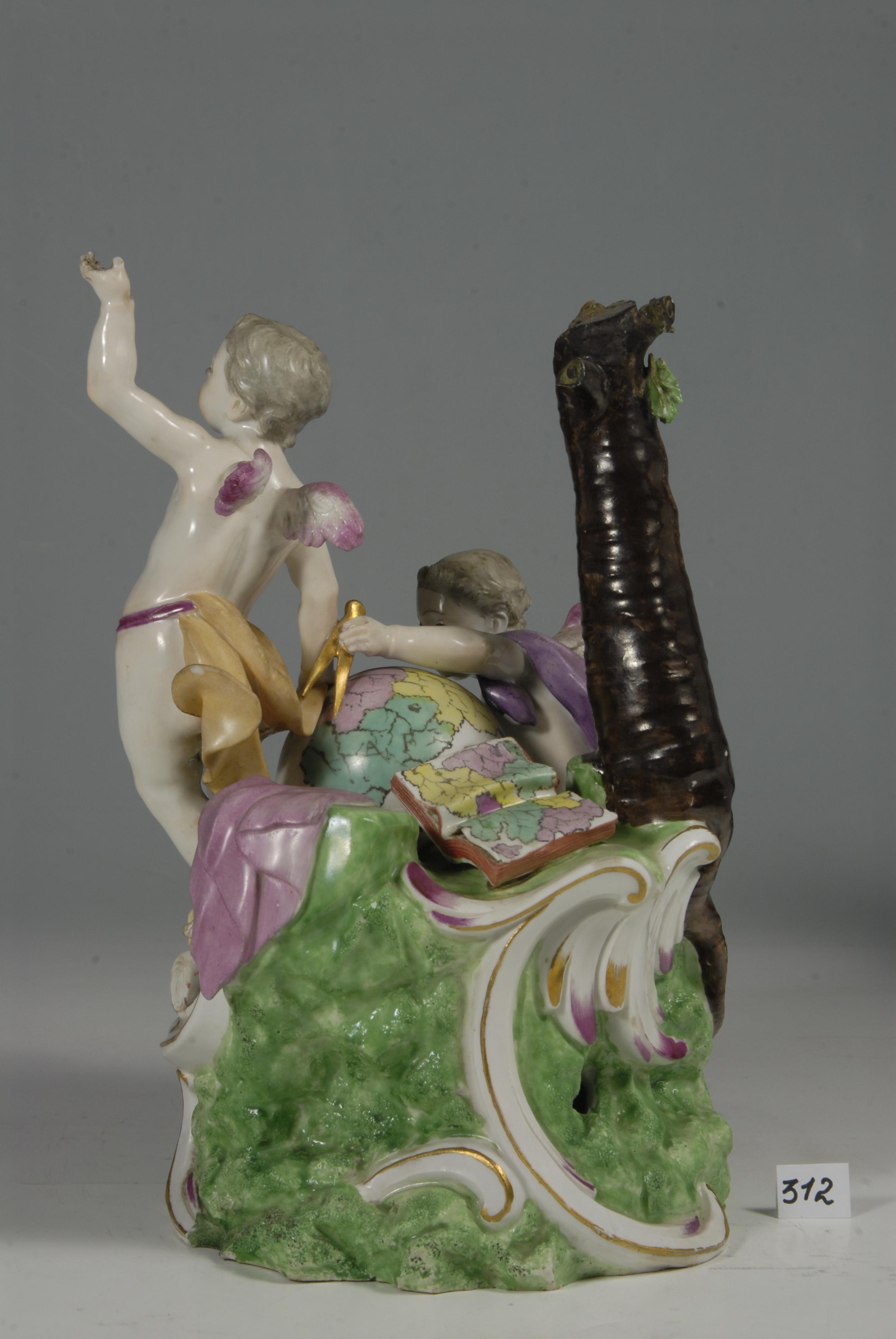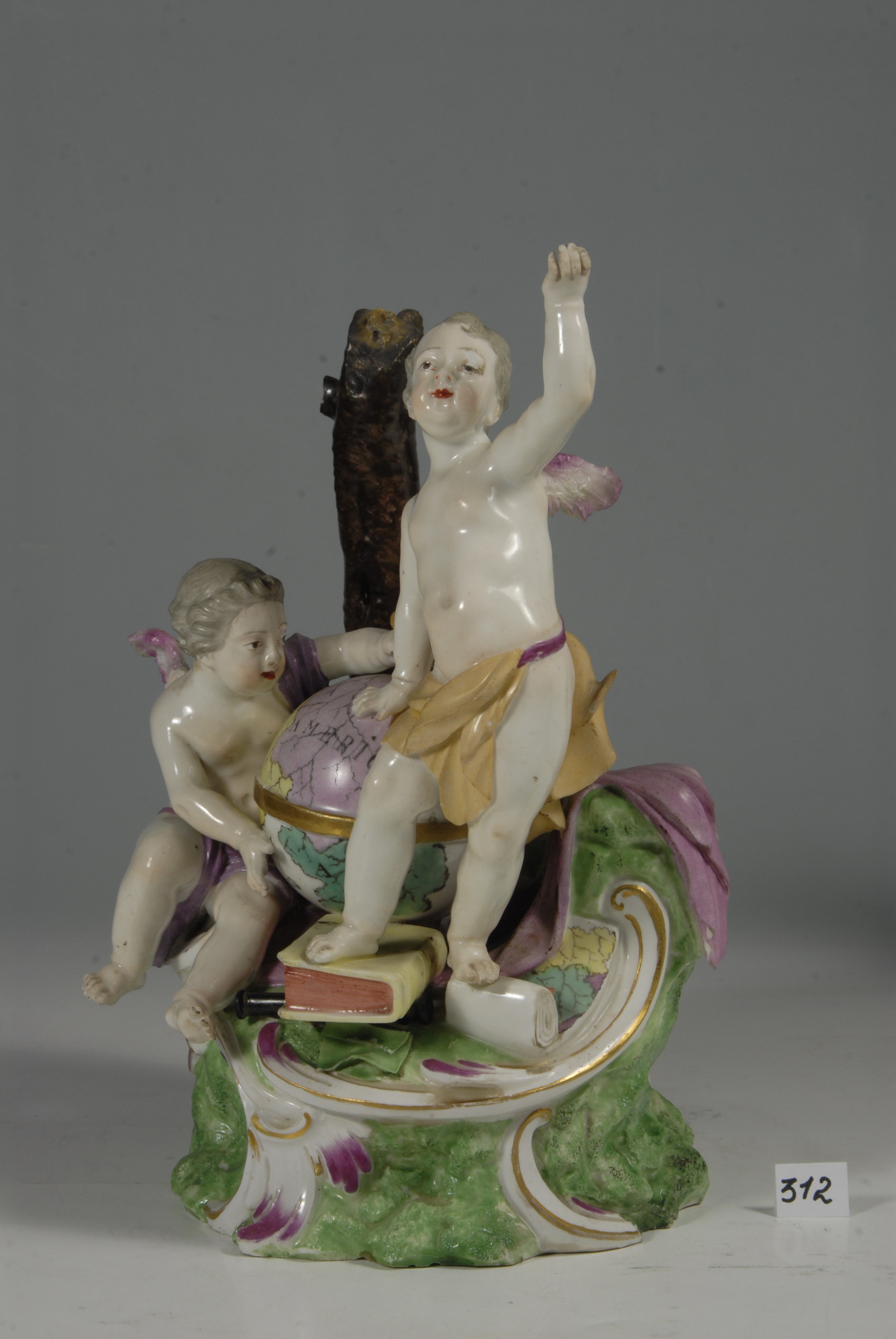 Історія Атрибуціi: Консультація Соловєйчік Р.С. (Ермітаж, 1961 р.) - Відень, 1760-і рр. (два амури з земною сферою. Серія "Сім вільних мистецтв")/Кількість: 1/Опис: Два амури з земною сферою; один із них, у бузковому плащі, сидить біля сфери з циркулем у лівій руці; інший стоїть, спираючись однією ногою на книку, піднявши ліву руку, а правою спираючись на сферу; його стегна прикриті жовтим плащем; позаду нього на землі лежить розкрита книга з картою. Підніжжя зелене високе, з рельєфними золоченими рокайлями.