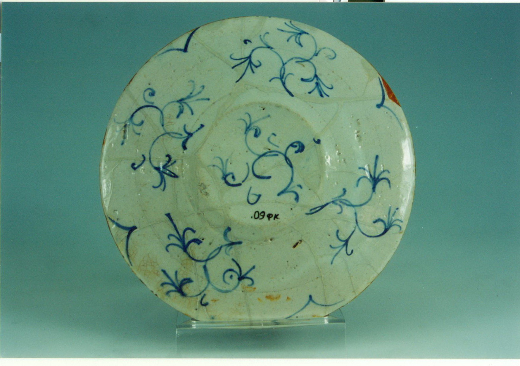 Розпис виконано світло-жовтими фарбами з блакитним прописом та тонким синім контуром на темно-синьому тлі.Новый материал: майоліка
